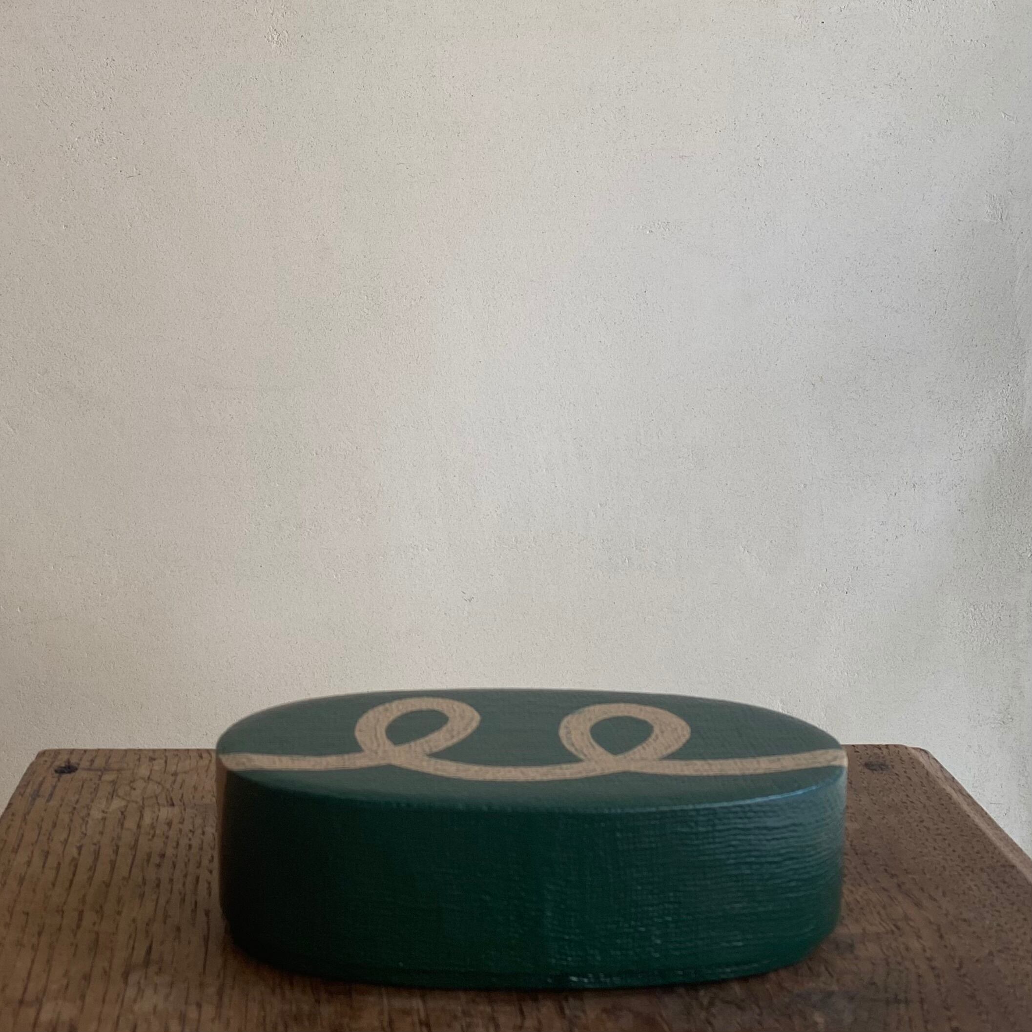 蓋の側面、裏側、グル-ン地にベージュのラインが自由に踊っています。