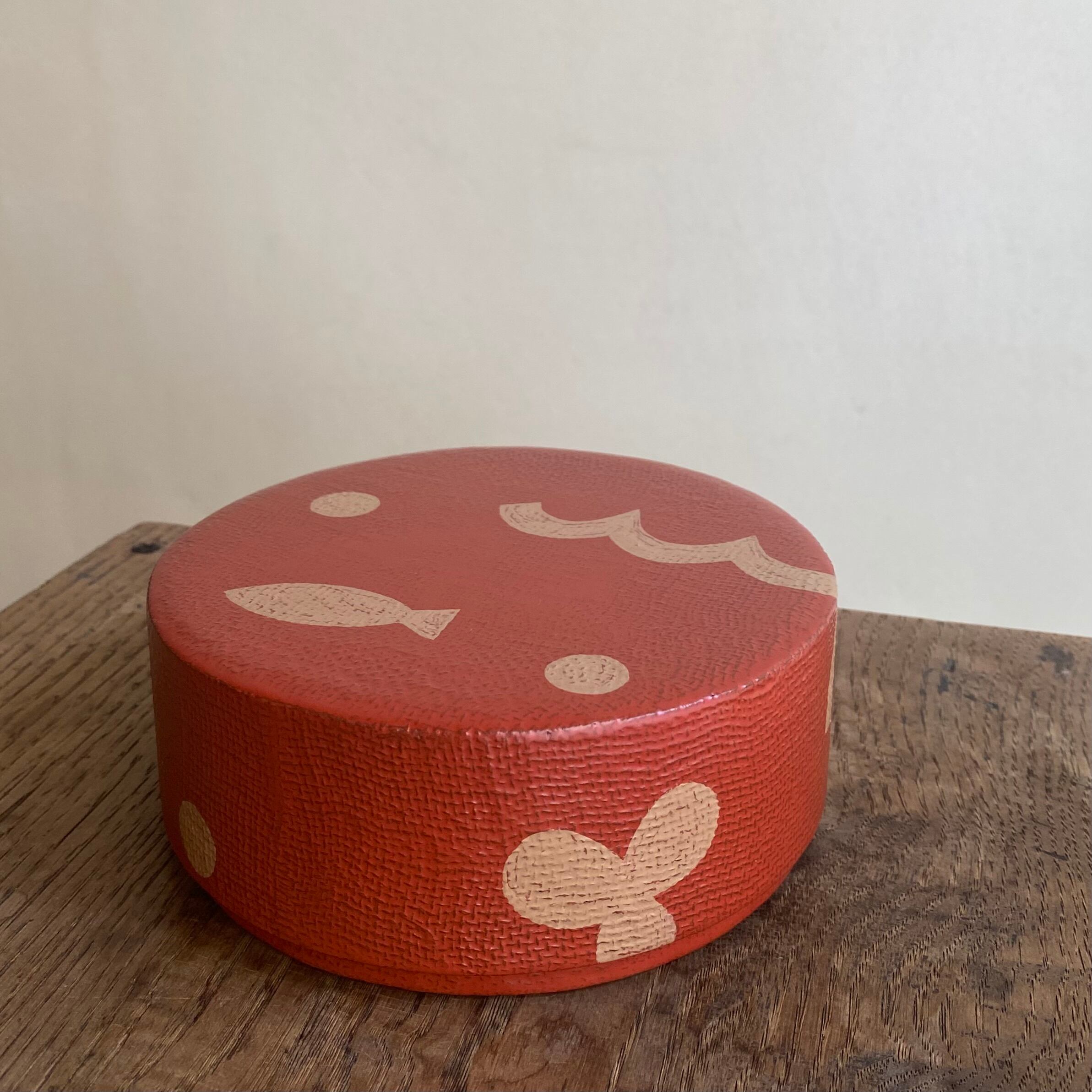 蓋の側面、裏側、、、赤地にベージュのラインやお魚モチーフなどが踊ります。