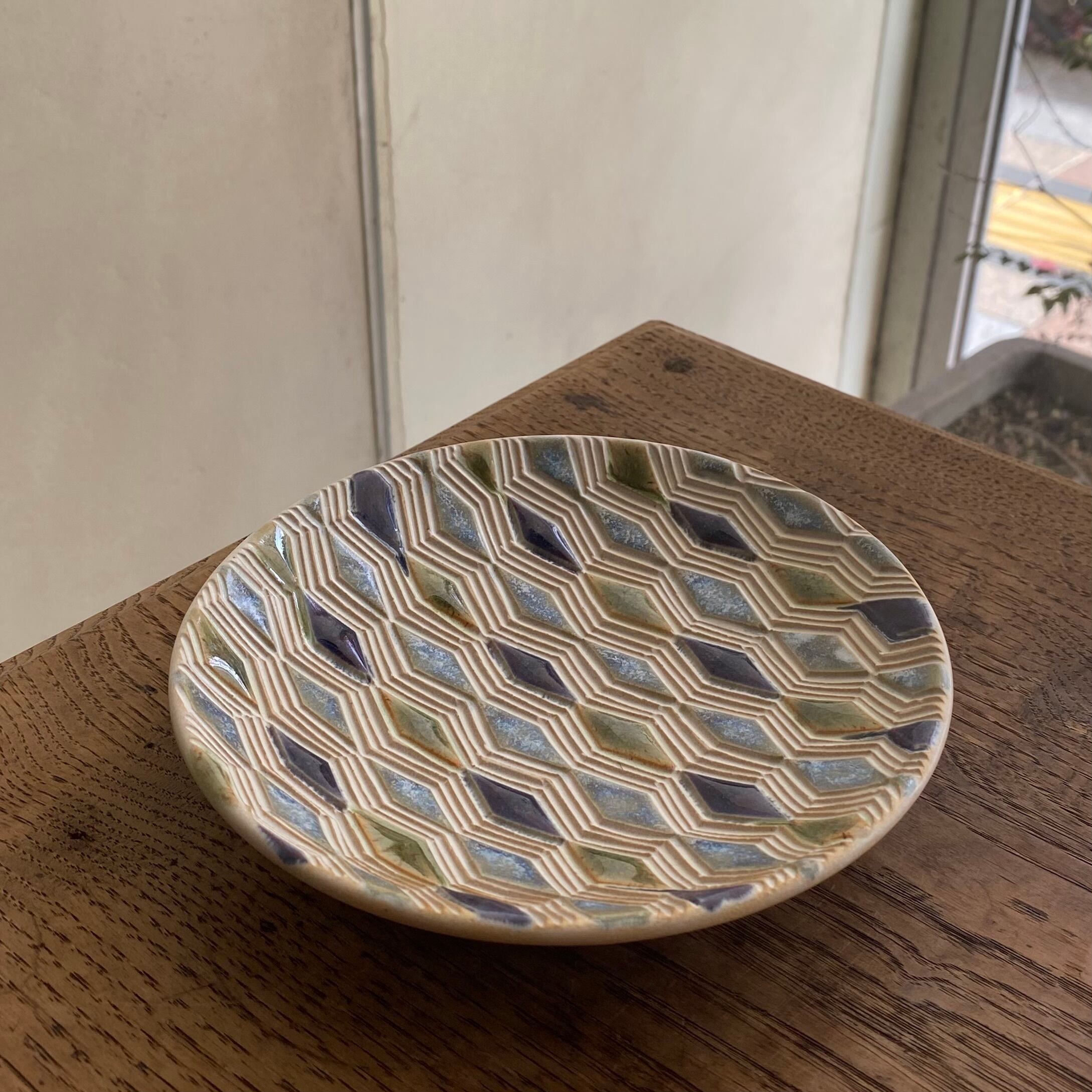水色・青・黄緑色の菱形のモチーフが鎬で立体的に表現されています。