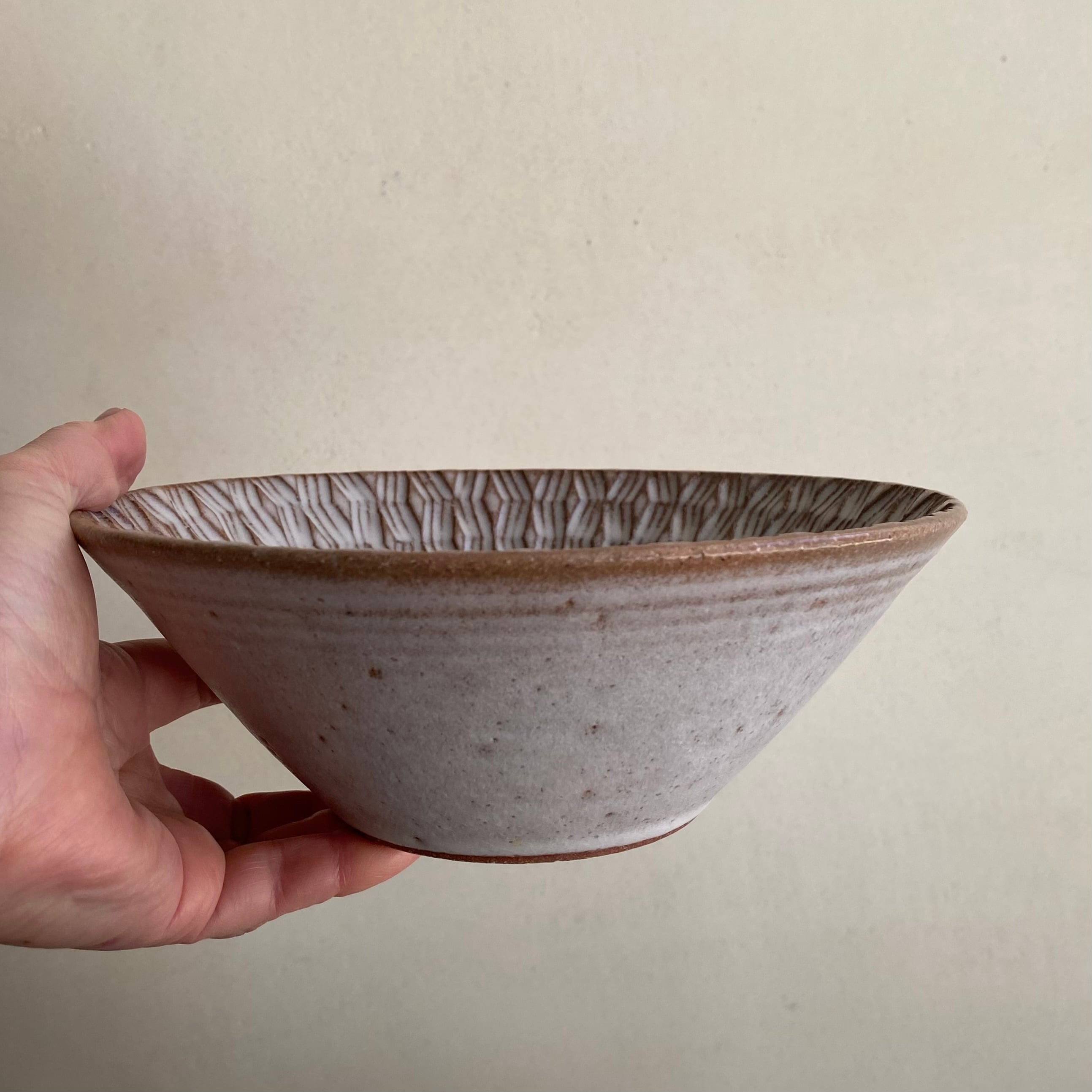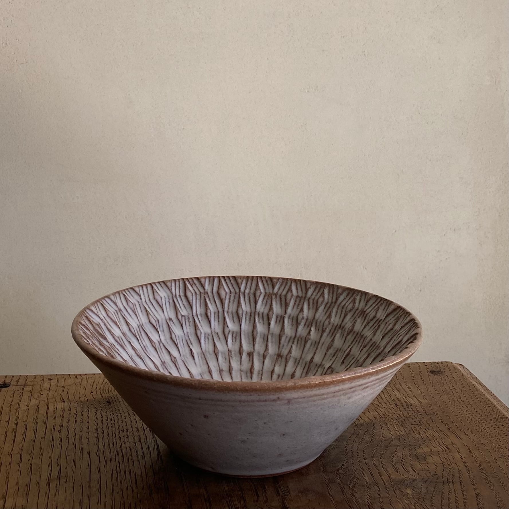 現在開催中の2人展「冬へのモチーフ」でご紹介をしているシノギの技法でモチーフを施した中鉢です。