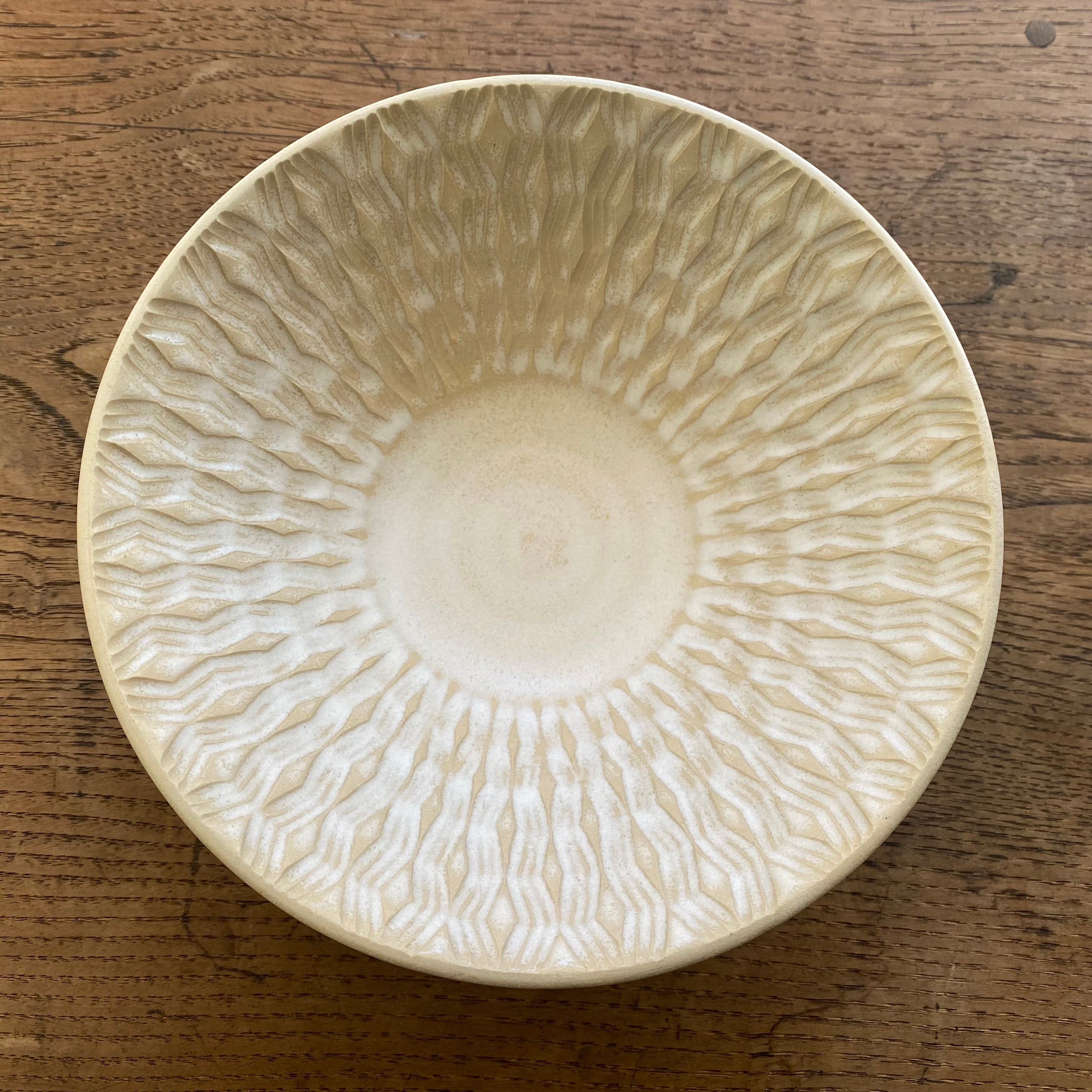 ヘラやカンナなどの道具を使って素地の表面を削り、立体的な稜線模様(りょうせんもよう)をつける装飾方法です。