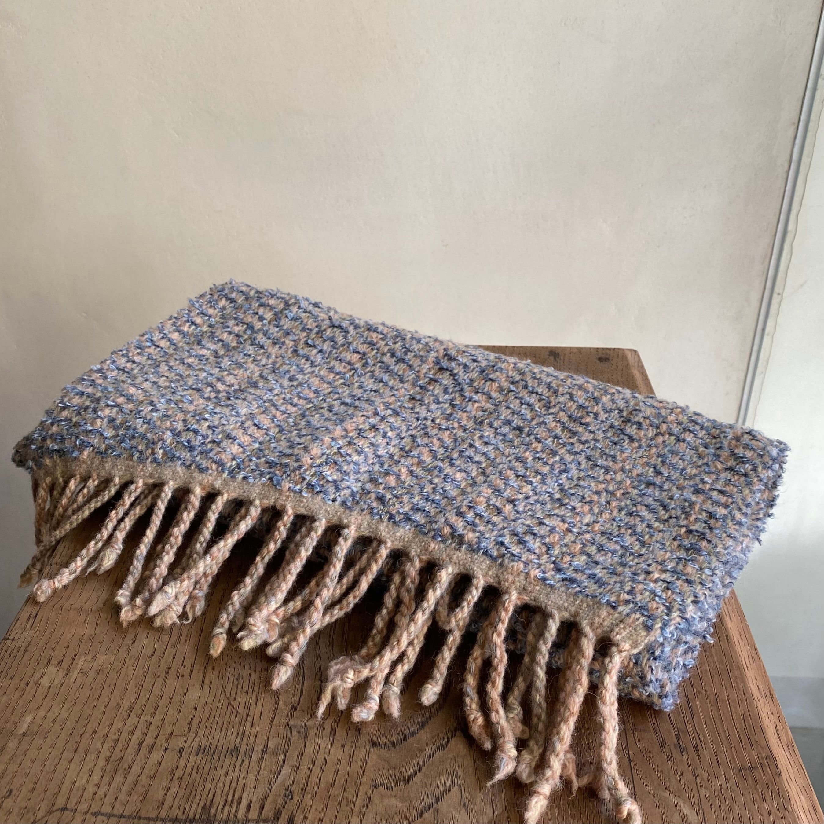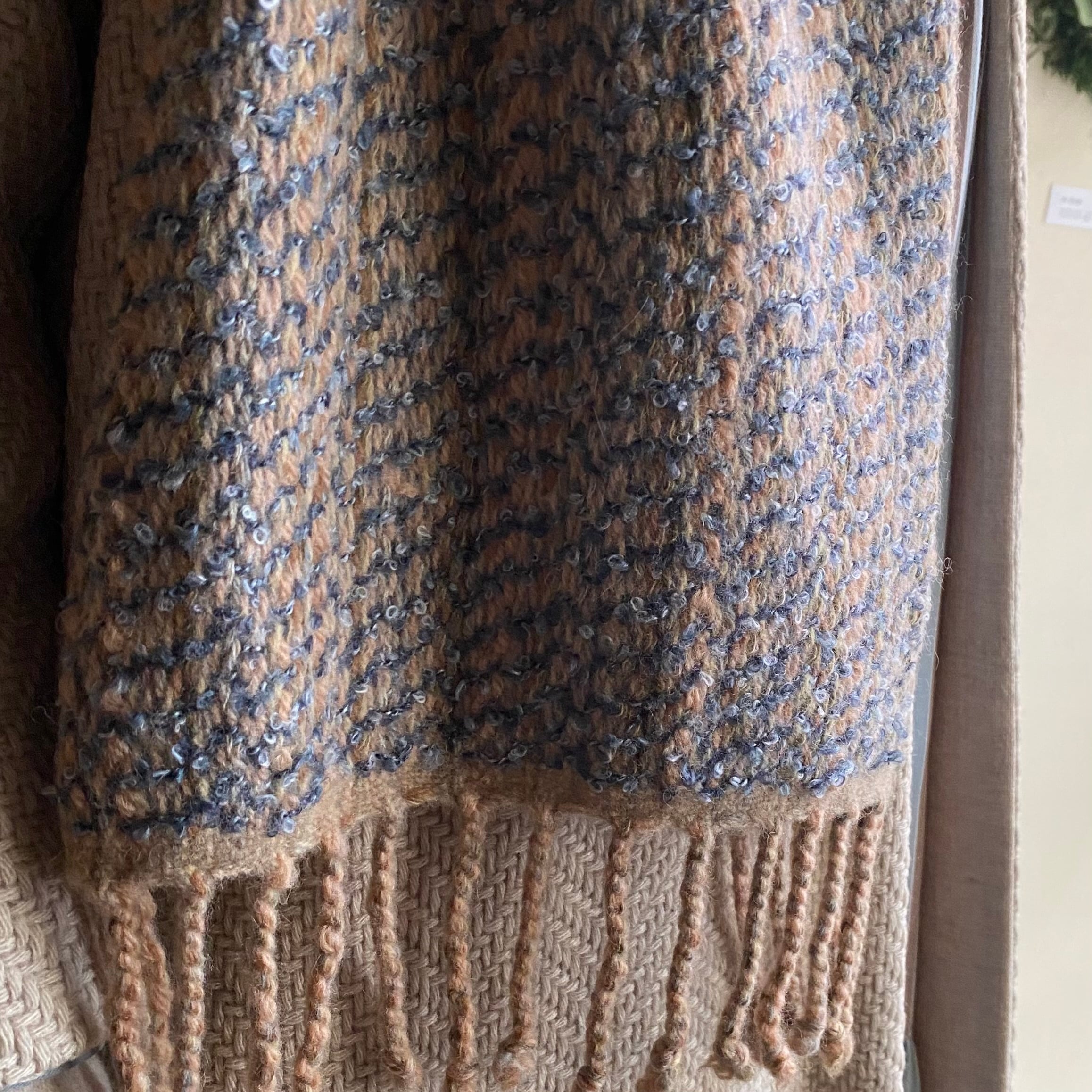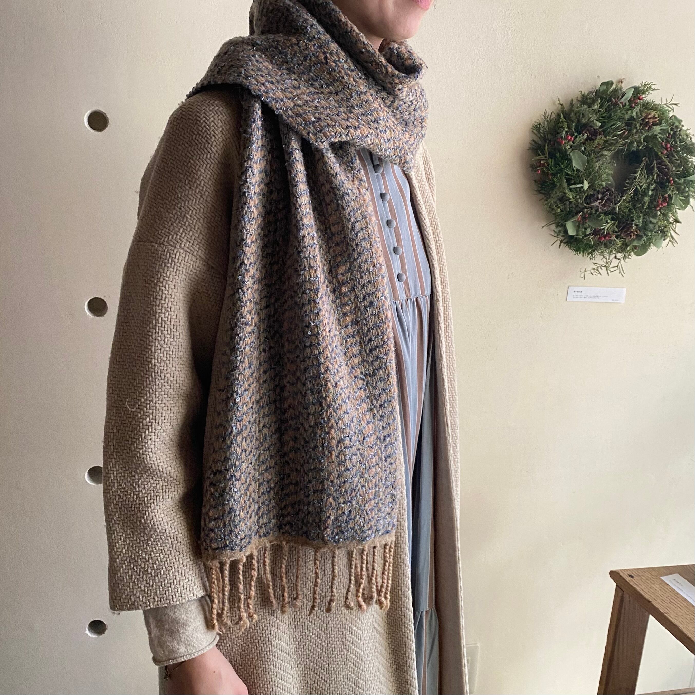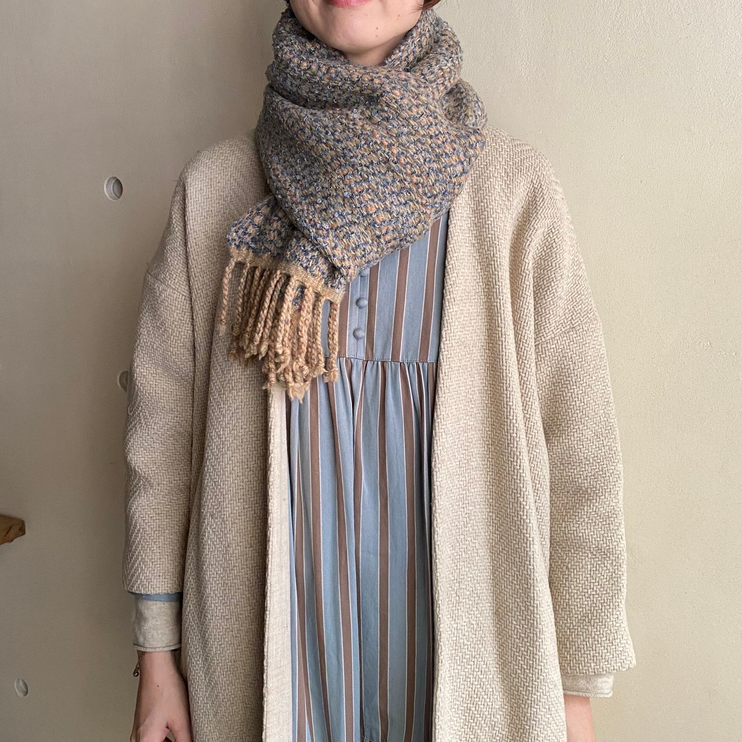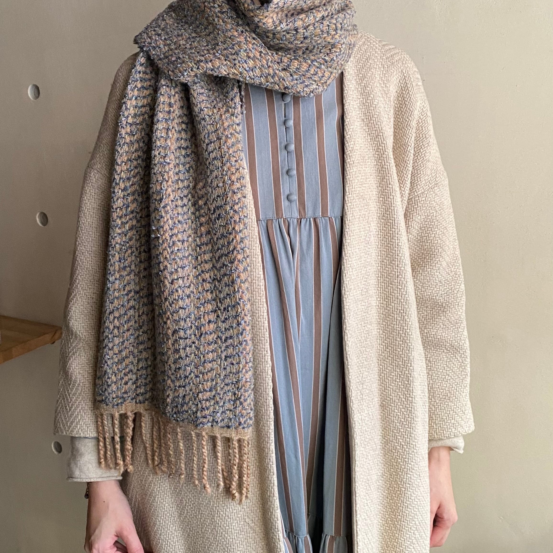 グレー、ブルー、ピンクベージュの糸で織られた優しい印象のストールです。