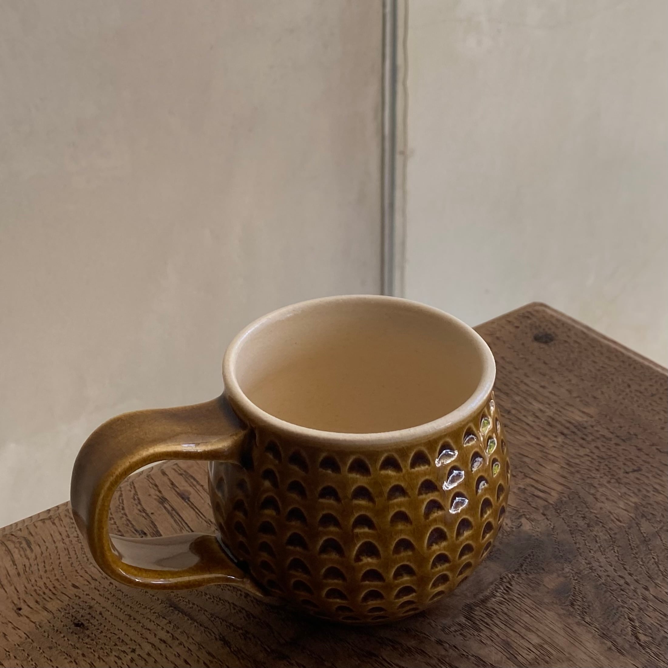 28日まで開催中「小谷田潤 うつわ展」でご紹介をしている、丸いシルエットのマグカップです。サンカクのしのぎが飴色に入っていて、フクロウやウズラのようにも見えてきます。