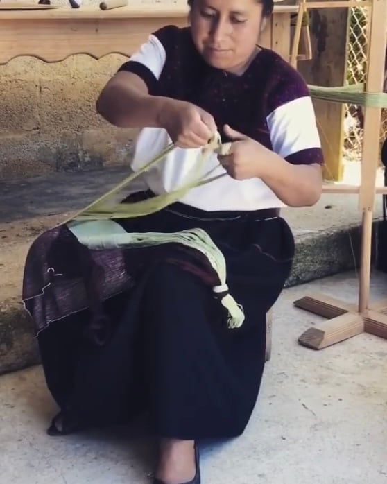 メキシコで古くから使われている腰機(こしばた)、経糸を張るための腰当てや腰帯などを備えた織機を使って織っています。