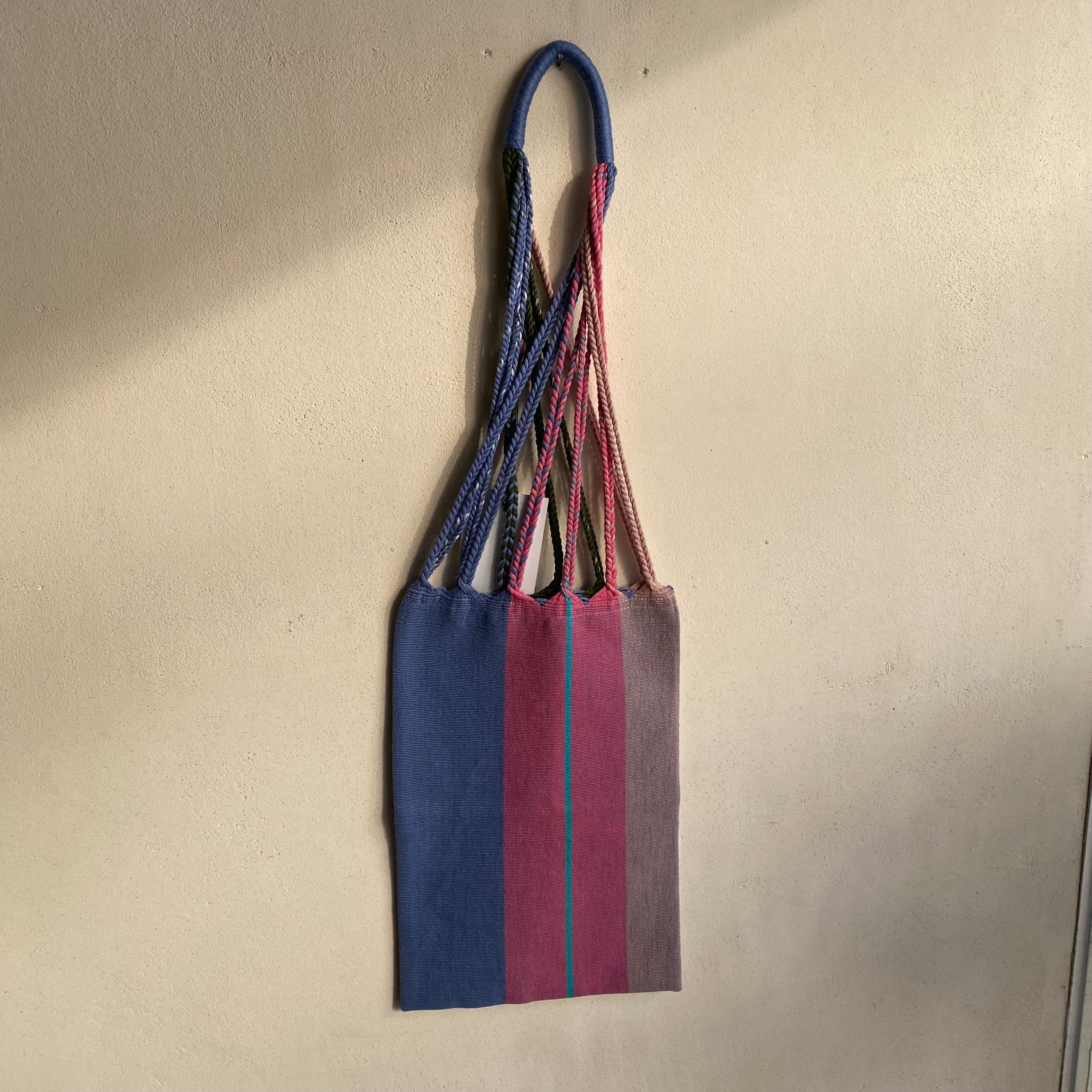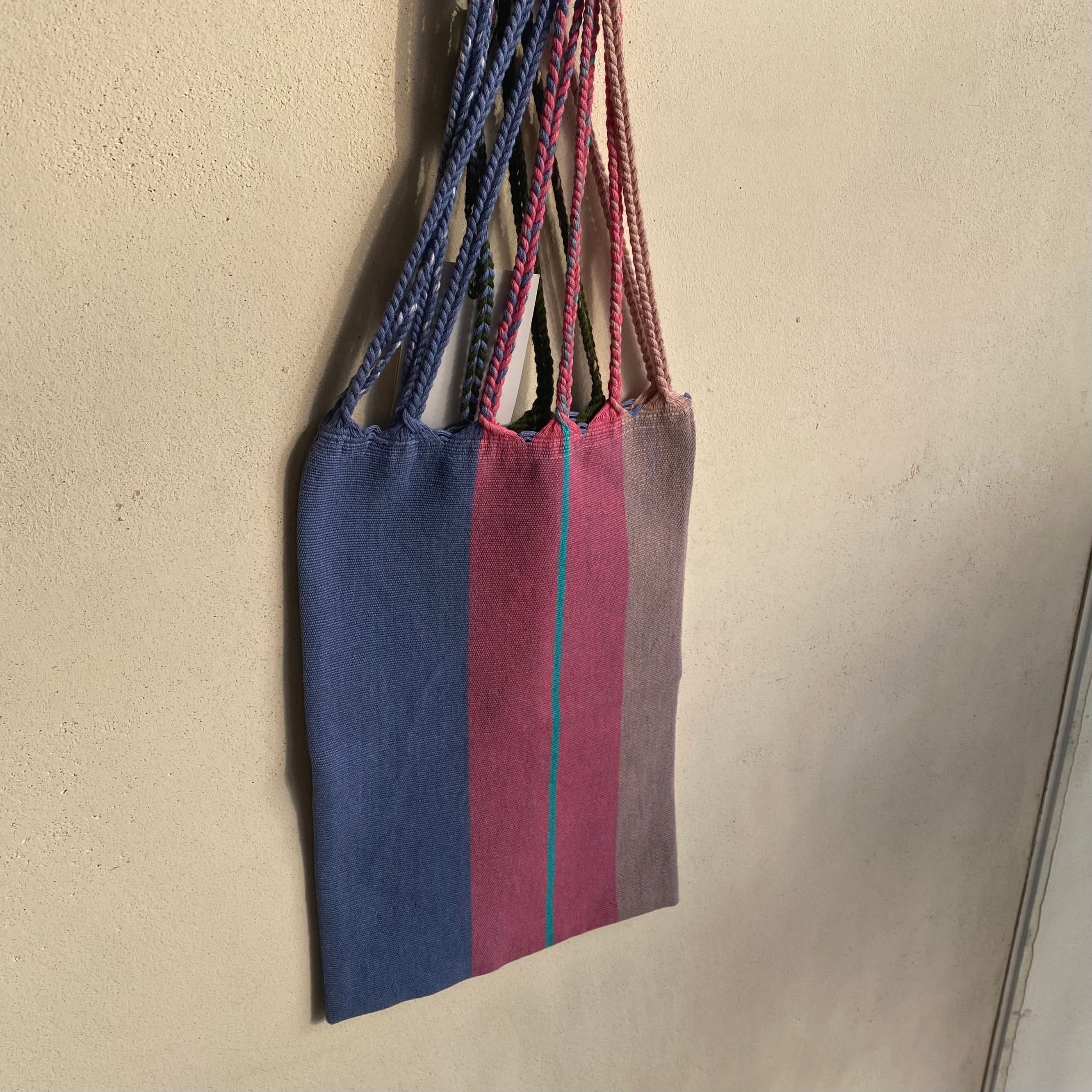 最もシンプルで、原始的な織機で丁寧に織られたハンモック状のコットンばっく、ハンドルは生地を織る際、縦糸を長く残し、1本1本縦糸を手作業でひねることで形成されています。