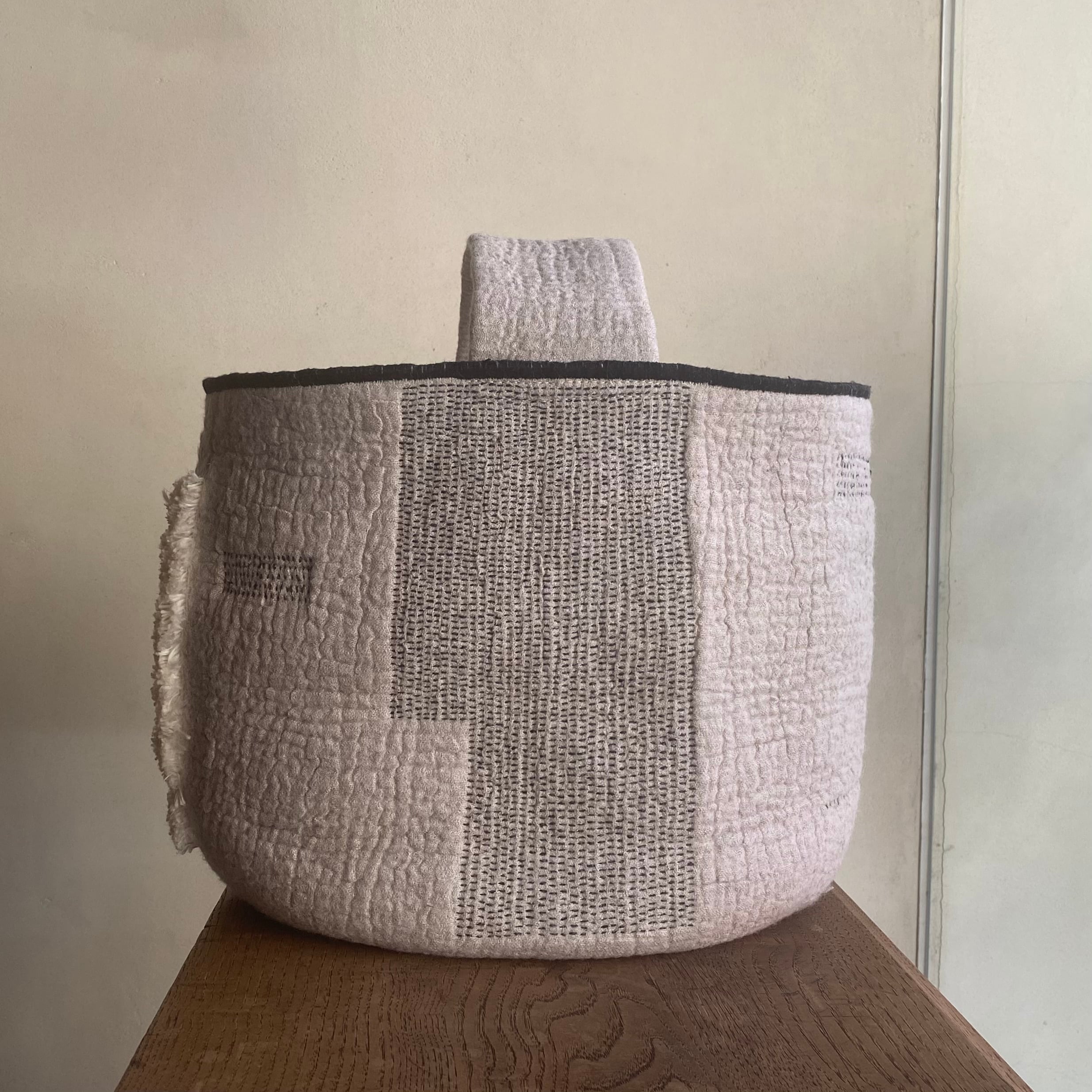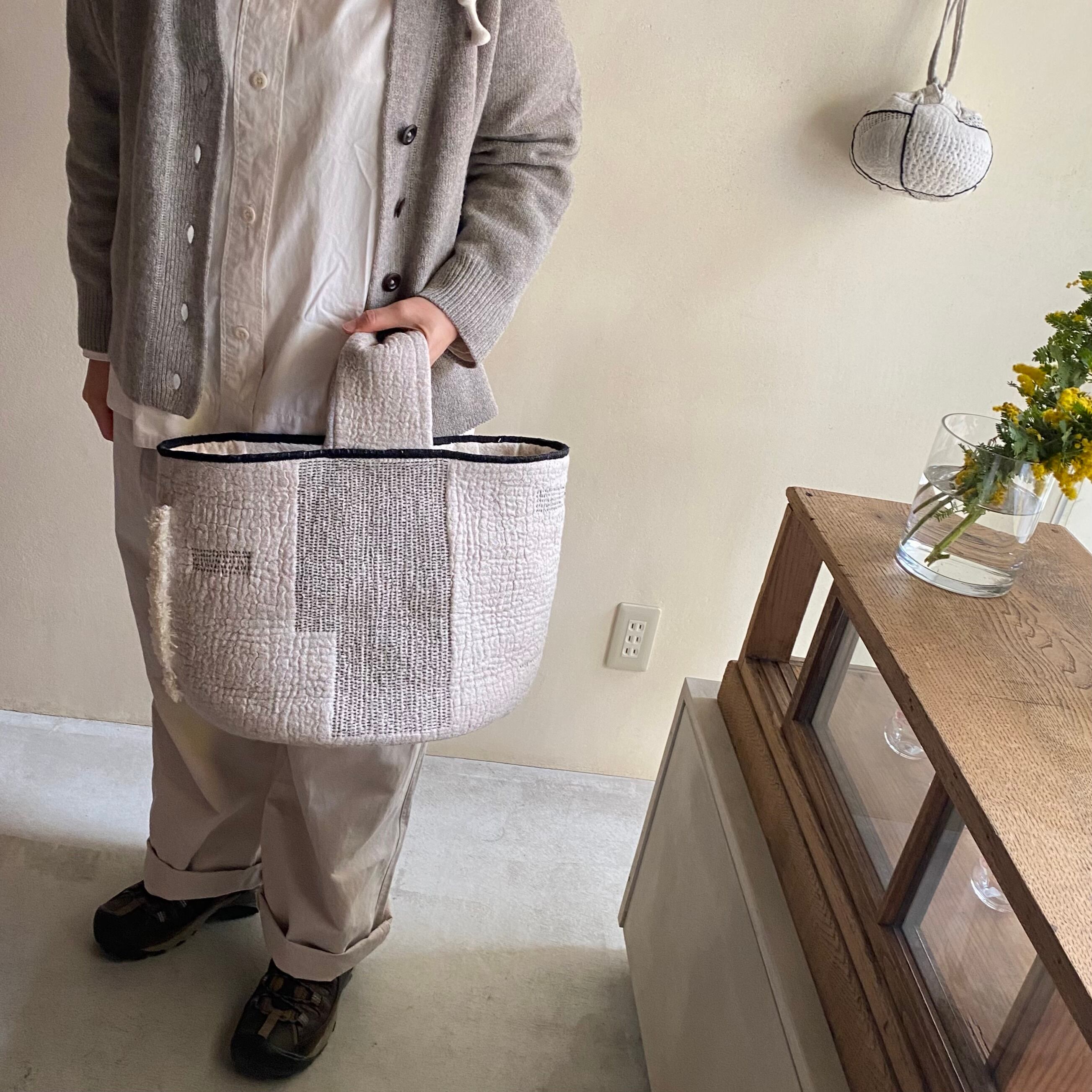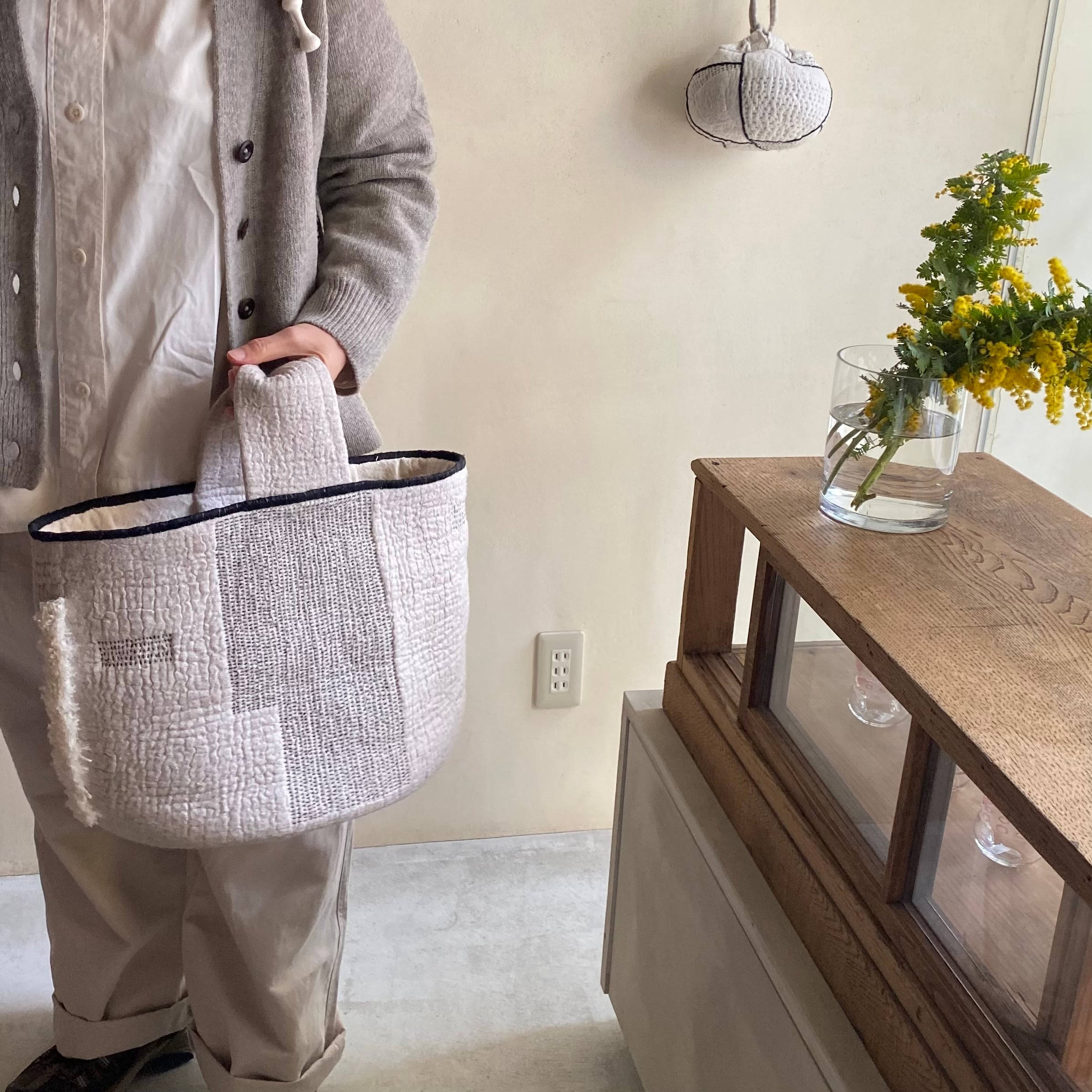 外側には手縫いで刺繍やノッテイングの技法で白いフサフサが出ていたりと、豊かな表情です。BAGの縁は黒い糸で手縫いでかがっています。
