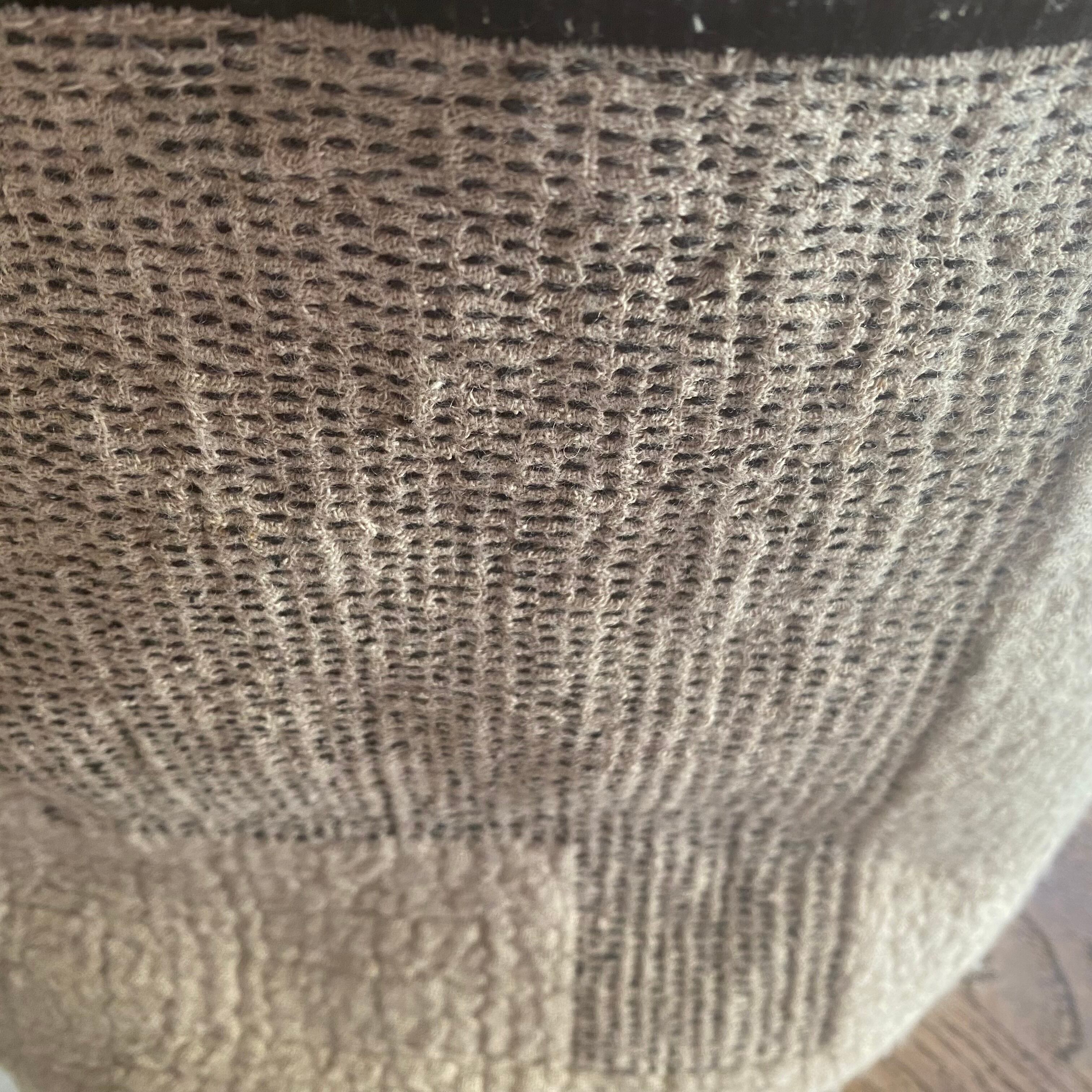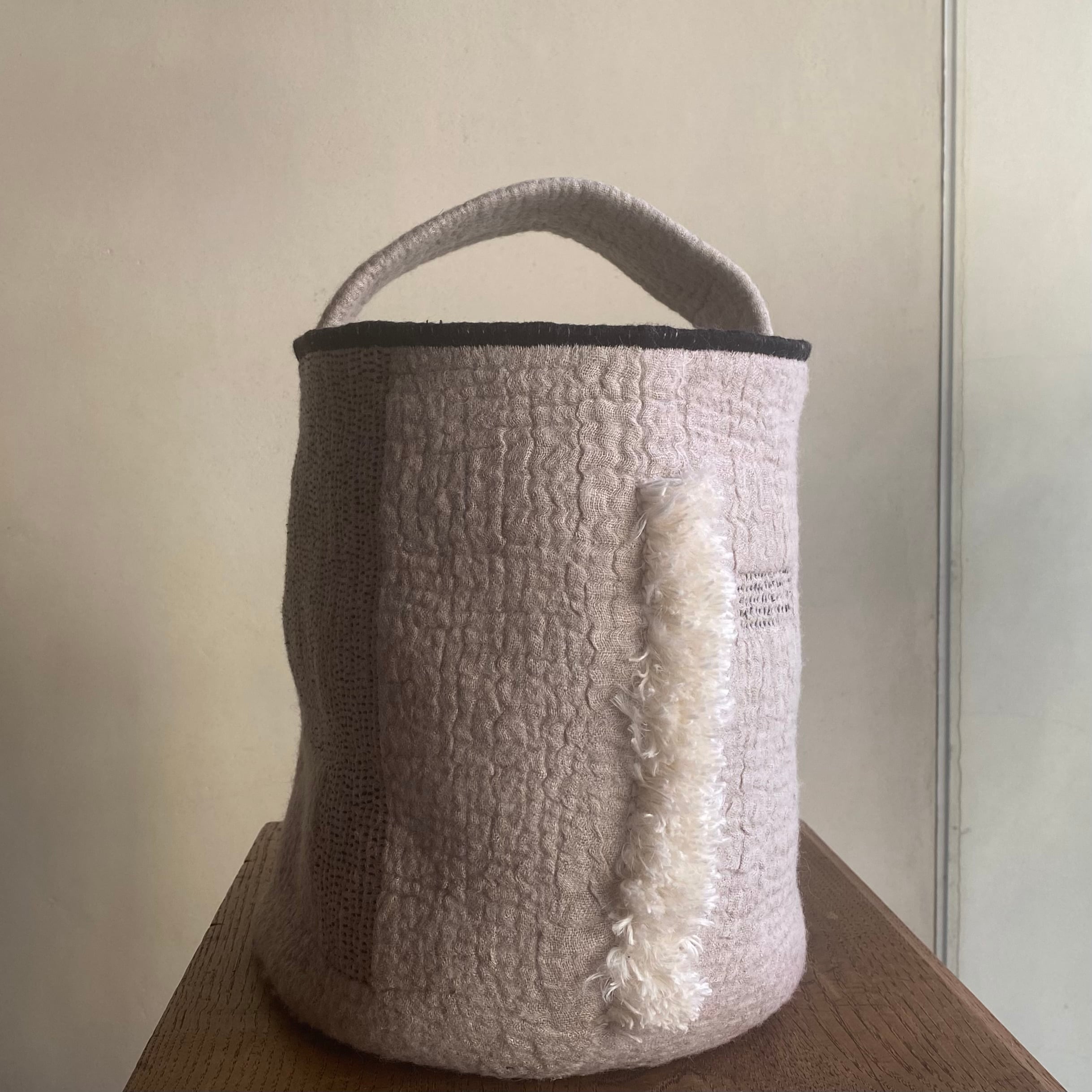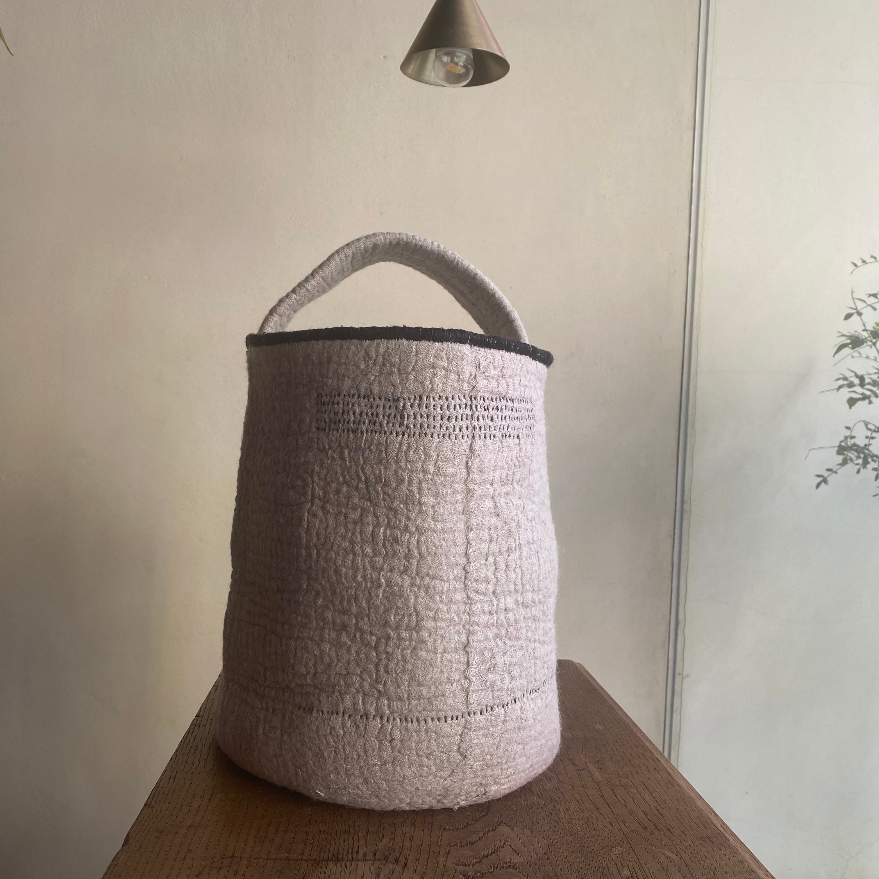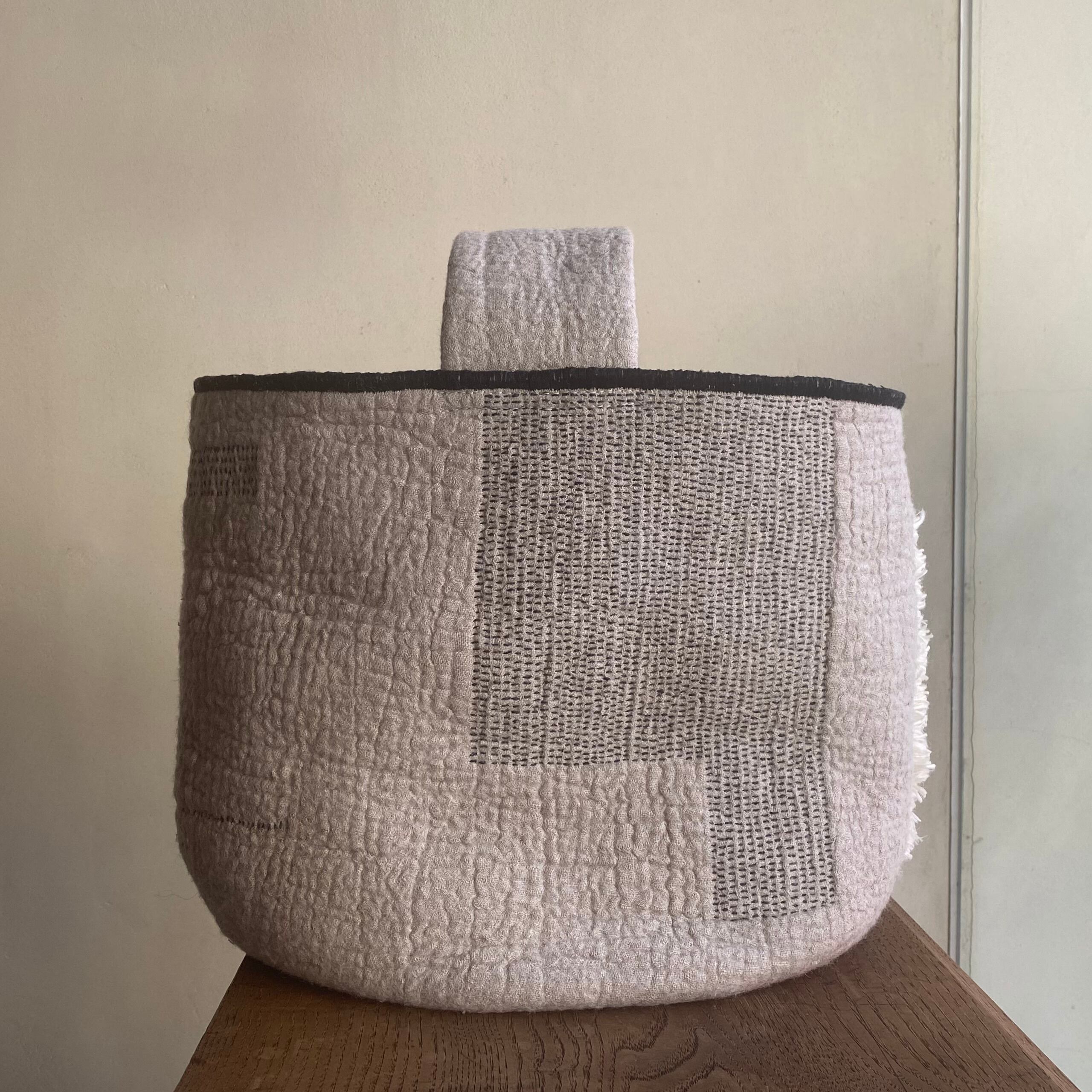 外側には手縫いで刺繍やノッテイングの技法で白いフサフサが出ていたりと、豊かな表情です。BAGの縁は黒い糸で手縫いでかがっています。