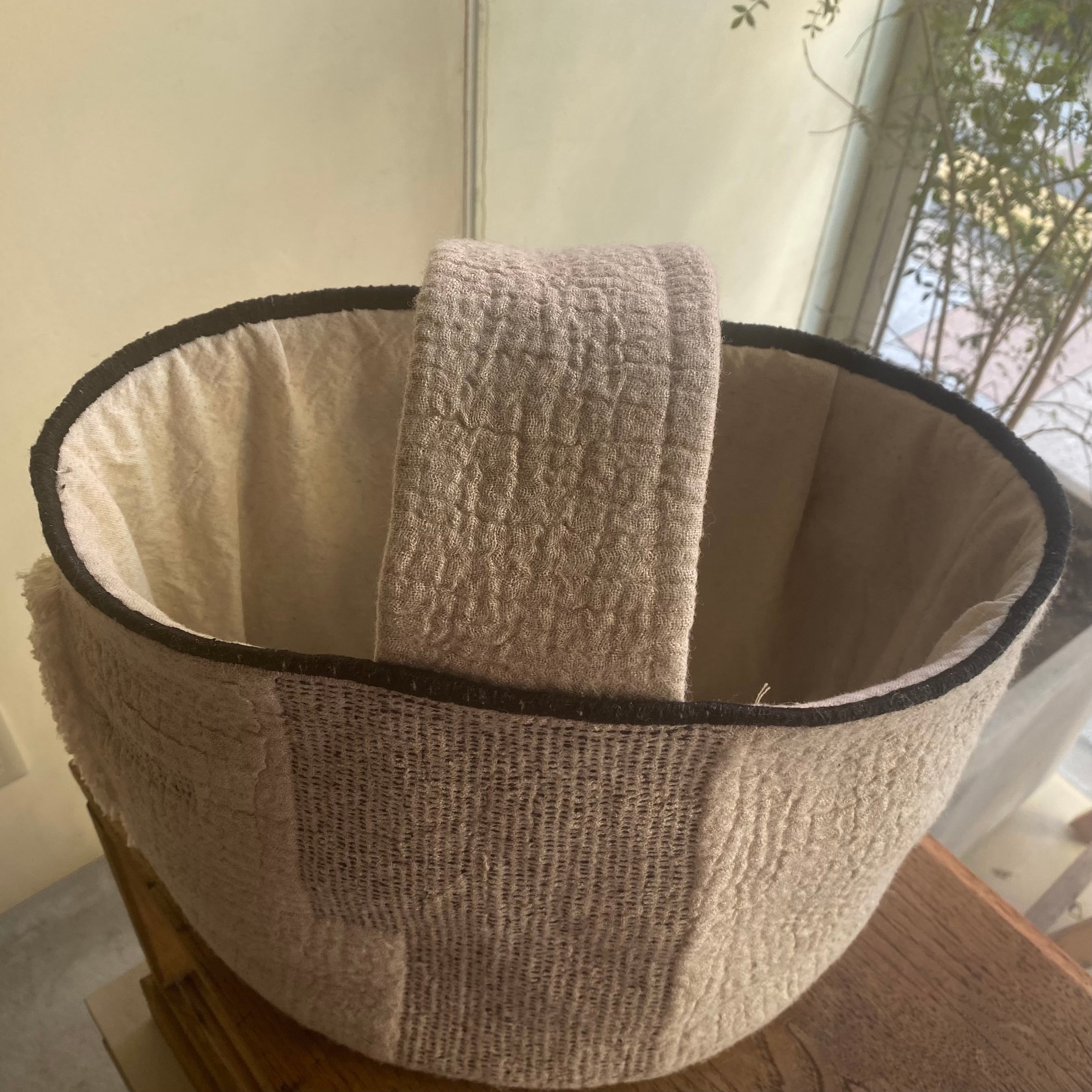 ワンハンドルで表地は麻布,内布には綿を使用しています。
