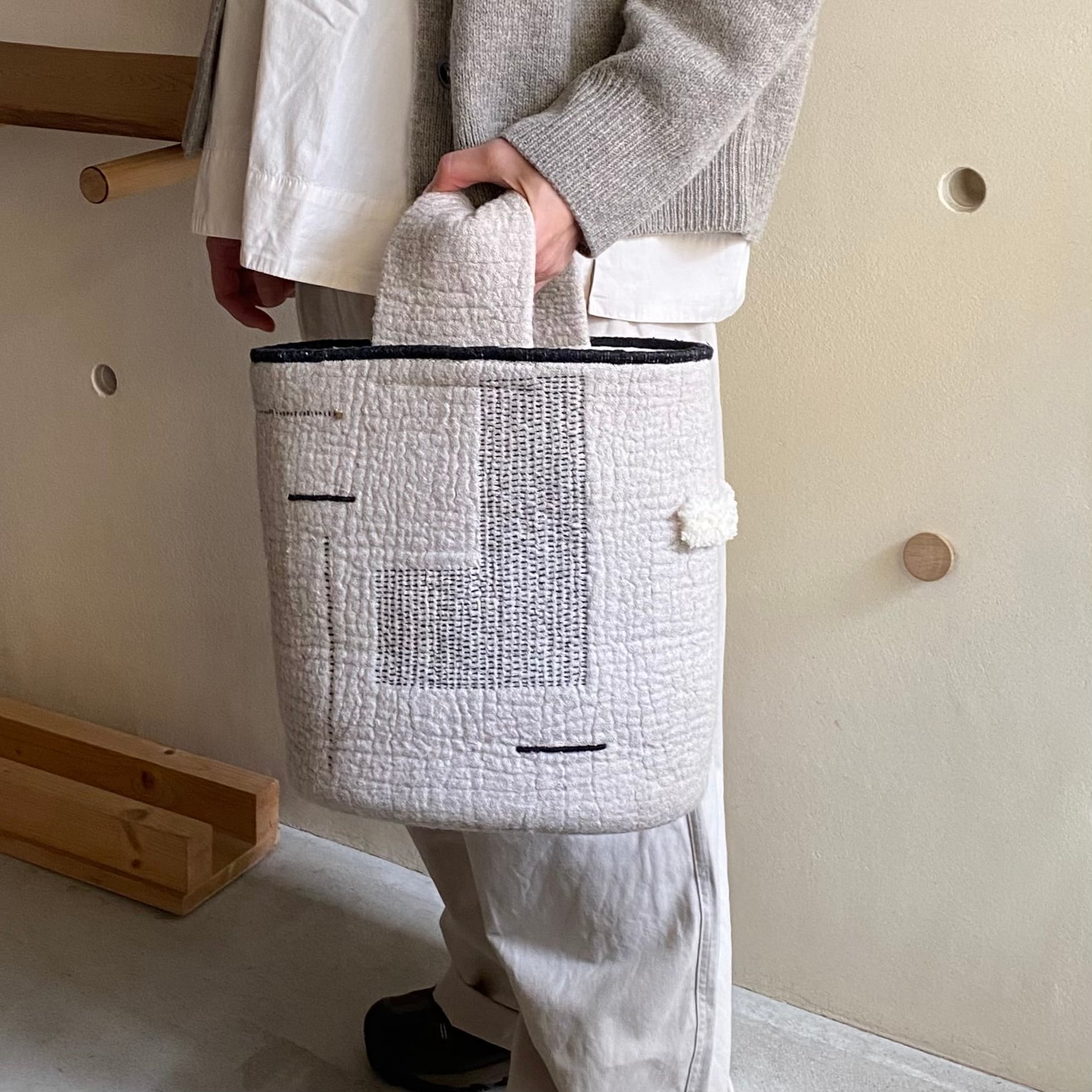 外側には手縫いで刺繍やノッテイングの技法で白いフサフサが出ていたりワンポイントで真鍮の飾りが付いていたりと表情が豊かです。BAGの縁は黒い糸で手縫いでかがっています。