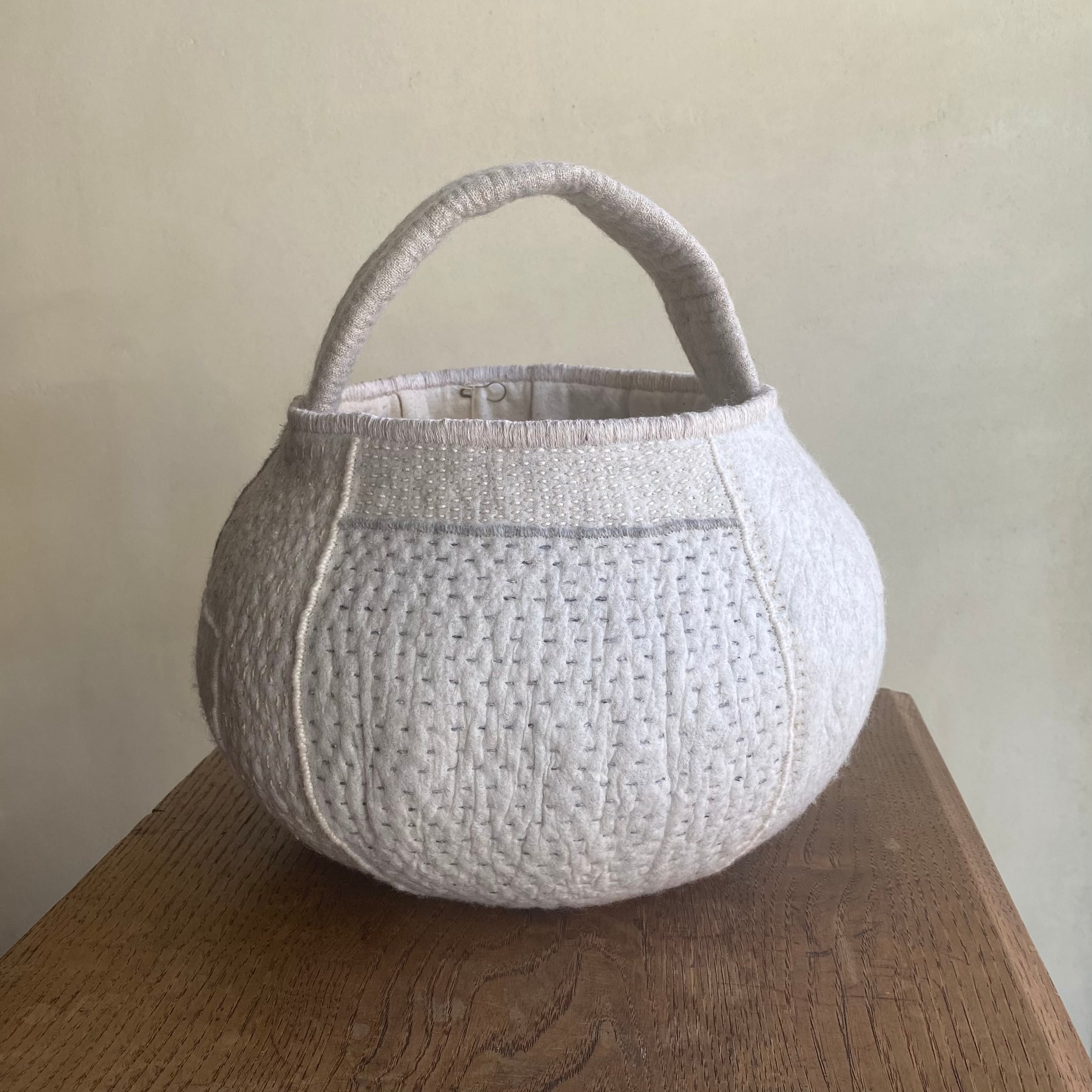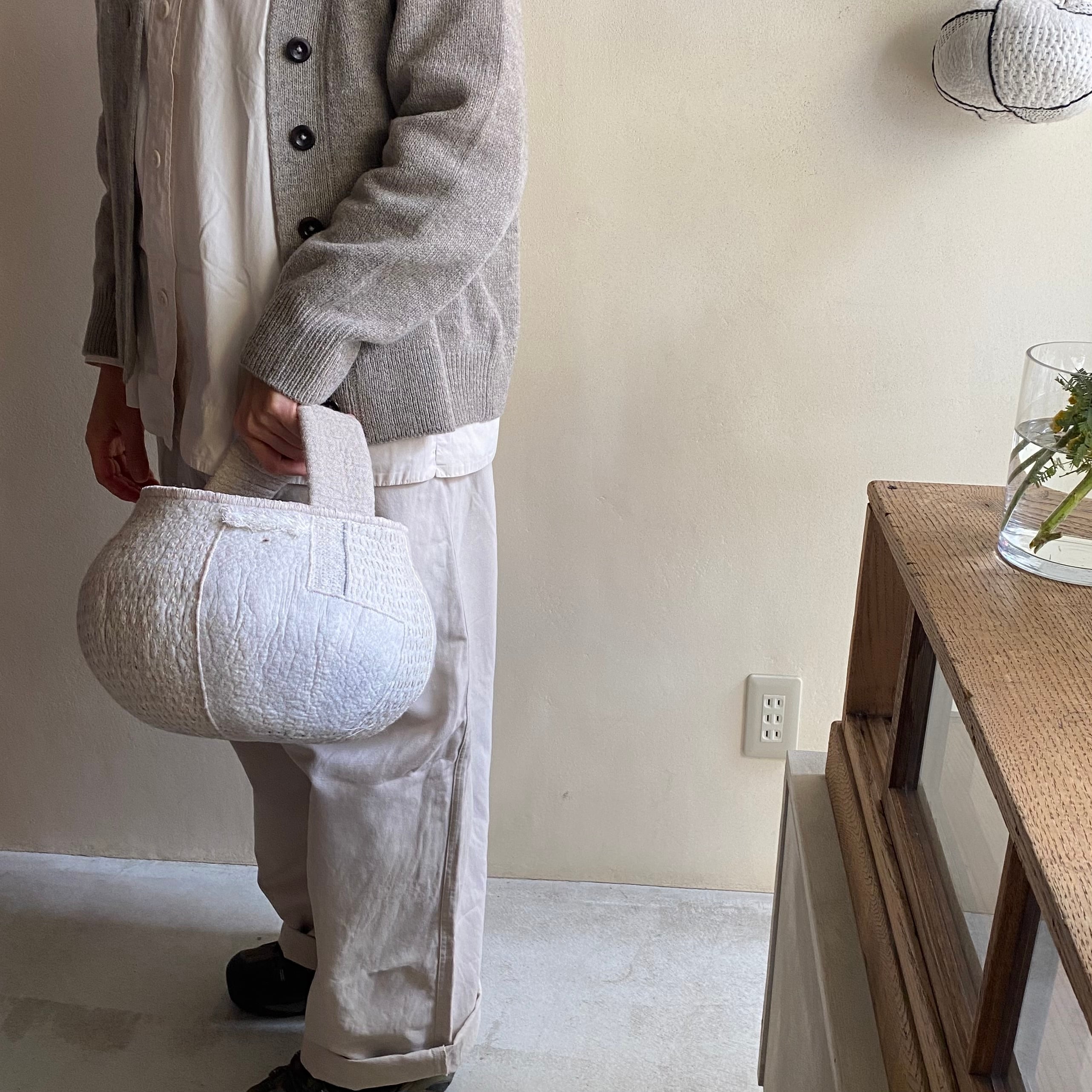外側には手縫いで刺繍やノッテイングの技法で白いフサフサが出ていたりワンポイントで真鍮の飾りが付いていたりと表情が豊かです。BAGの生成色の糸を手縫いでかがっています。