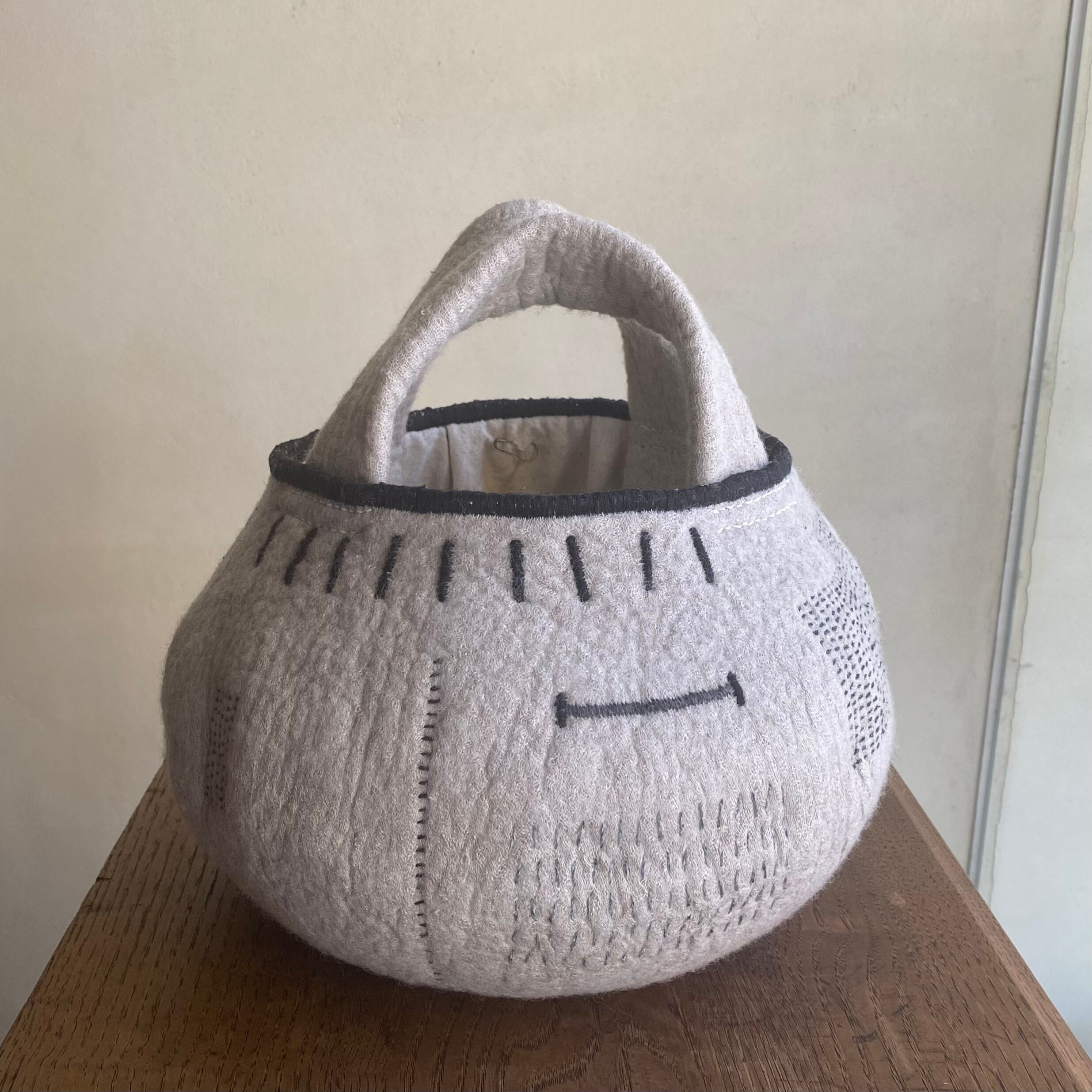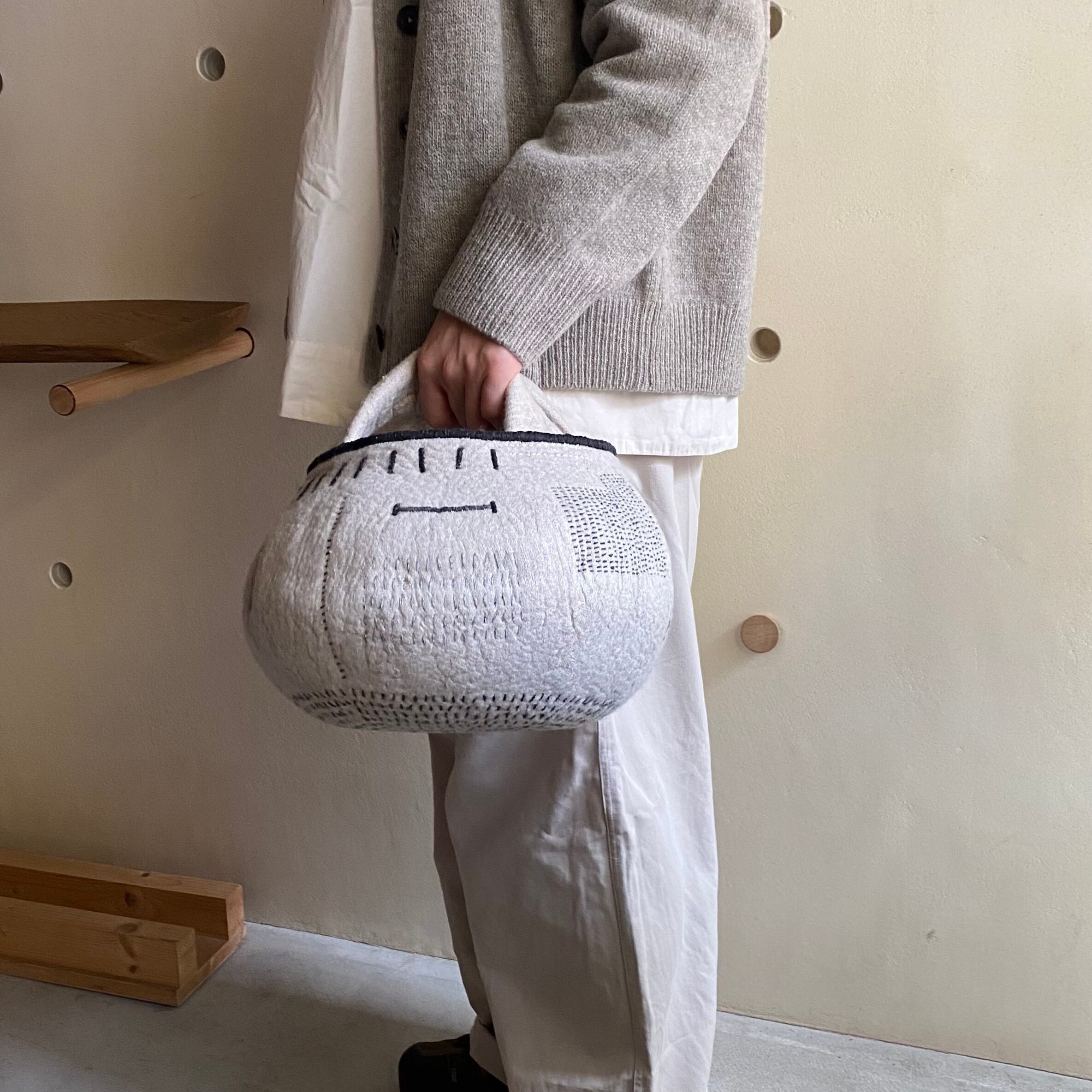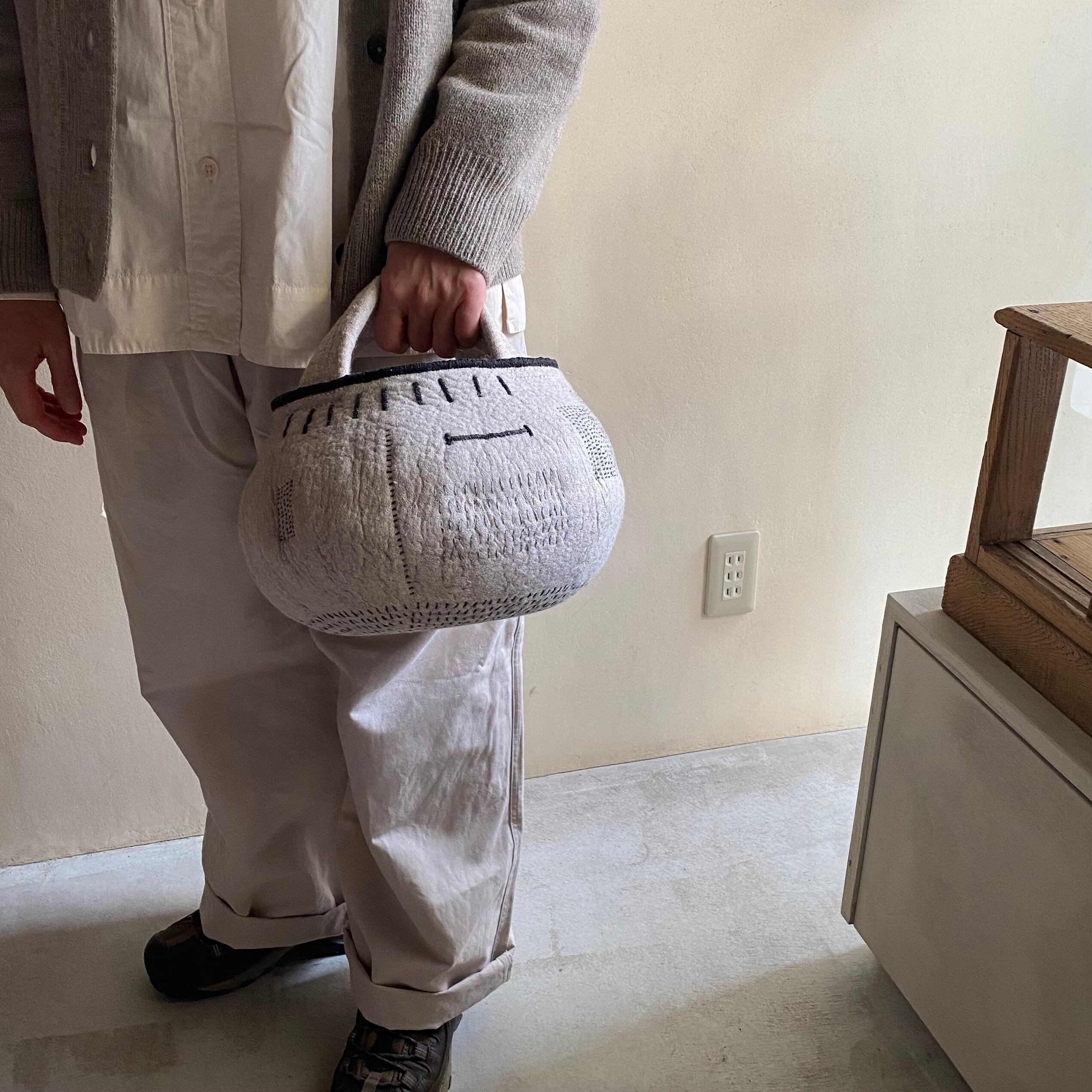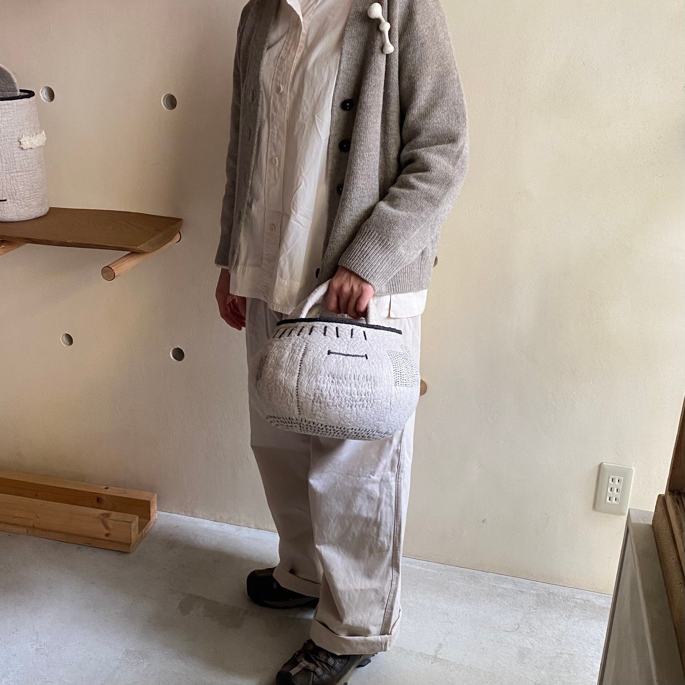 外側には手縫いで刺繍やノッテイングの技法で白いフサフサが出ていたりワンポイントで真鍮の飾りが付いていたりと表情が豊かです。BAGの生成色の糸を手縫いでかがっています。