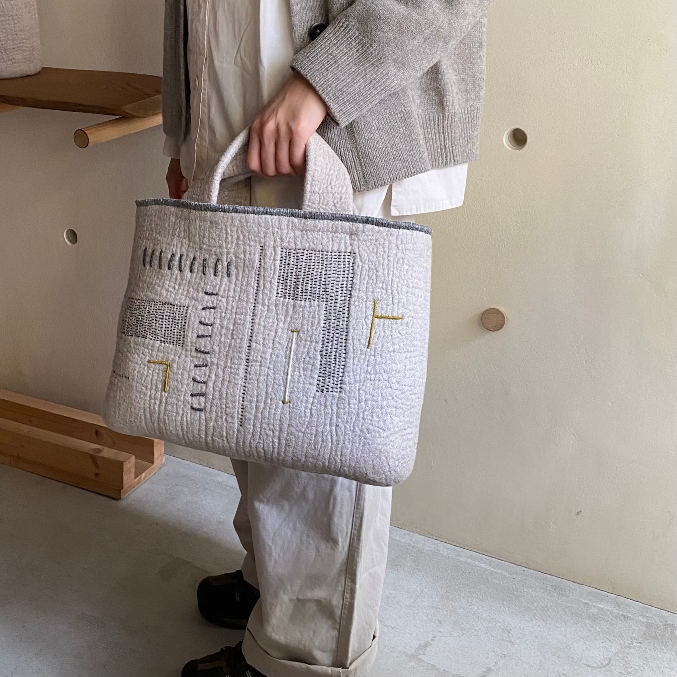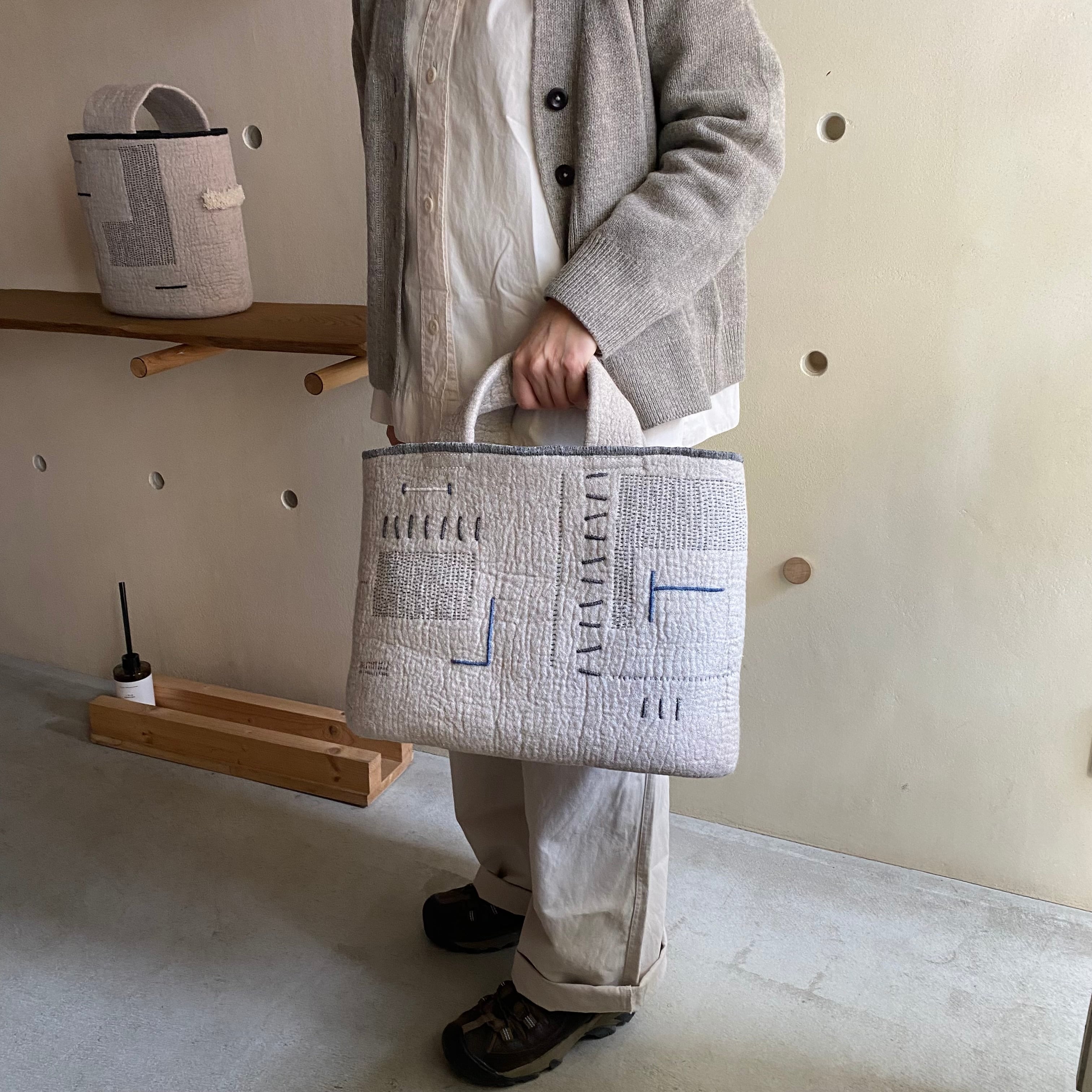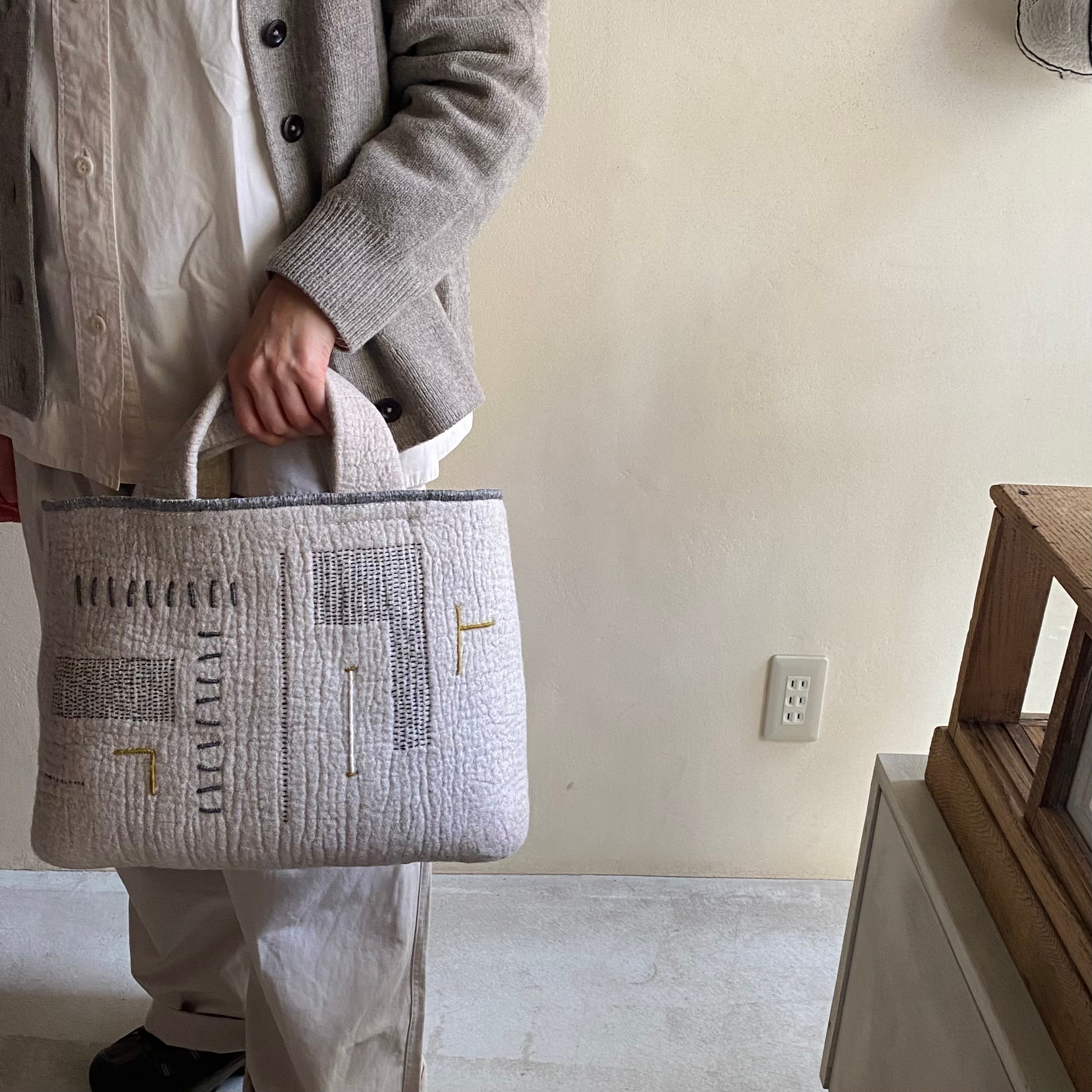外側には手縫いでマスタードイエローやグレーの糸で刺繍が施されています。BAGの縁もグレーの糸を手縫いでかがっています。