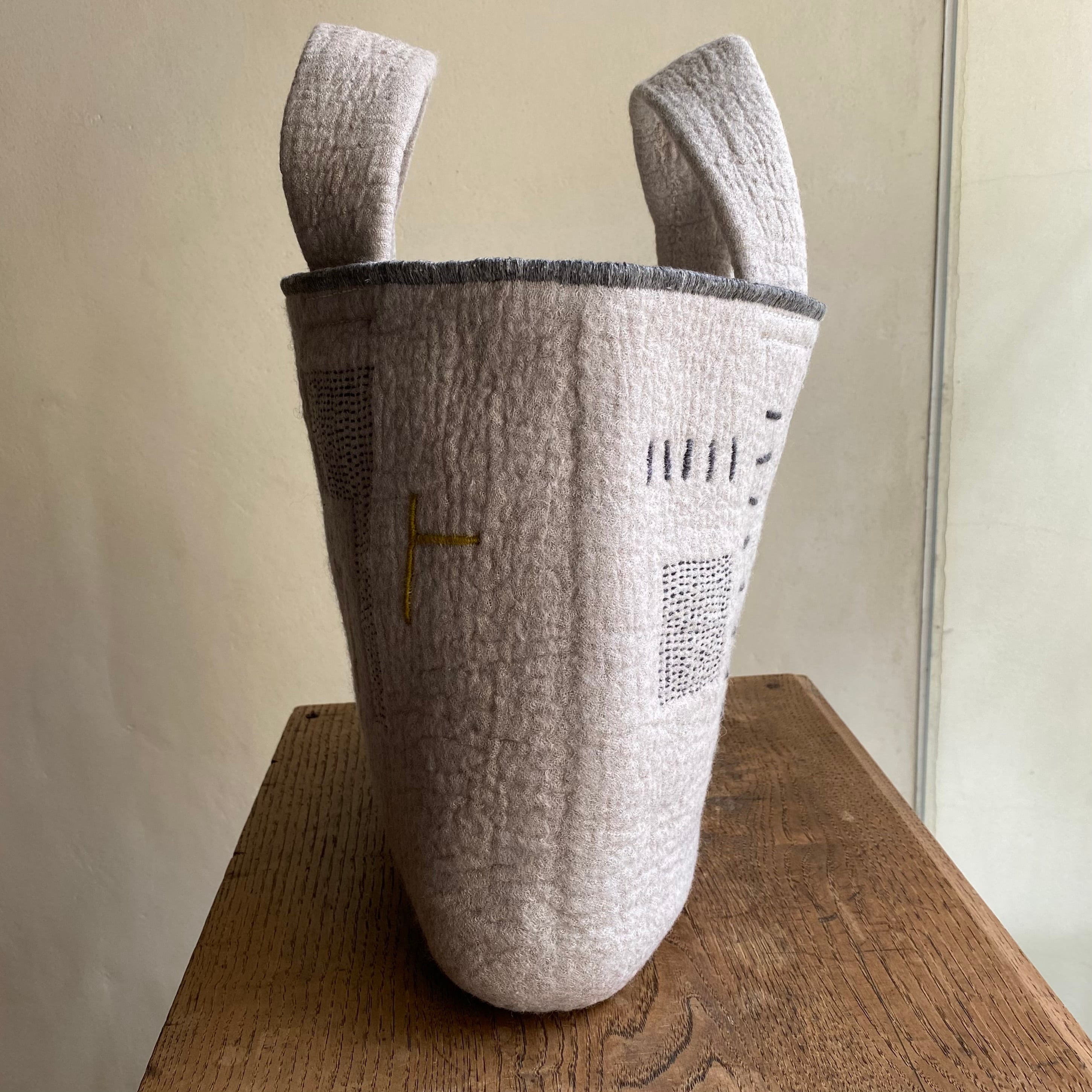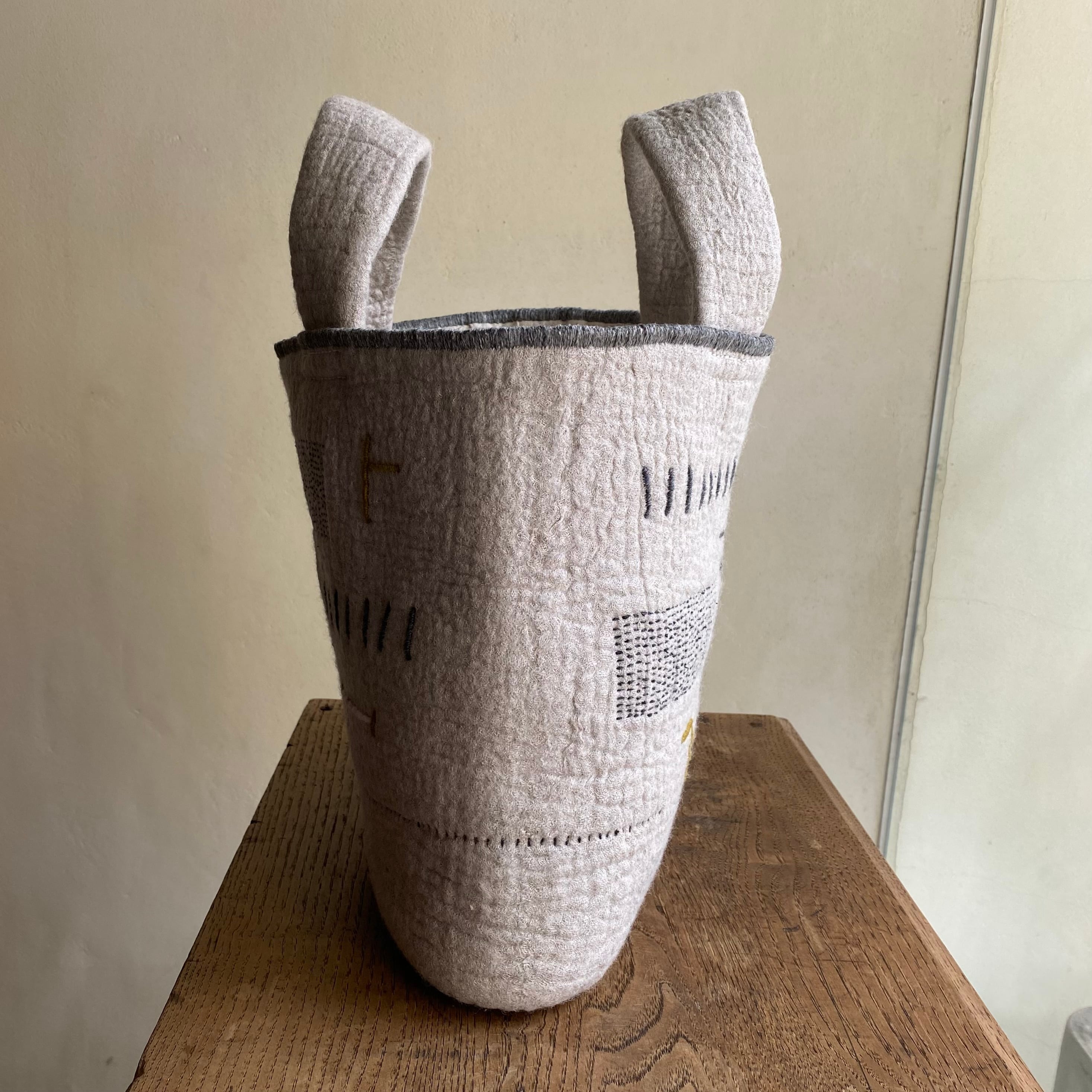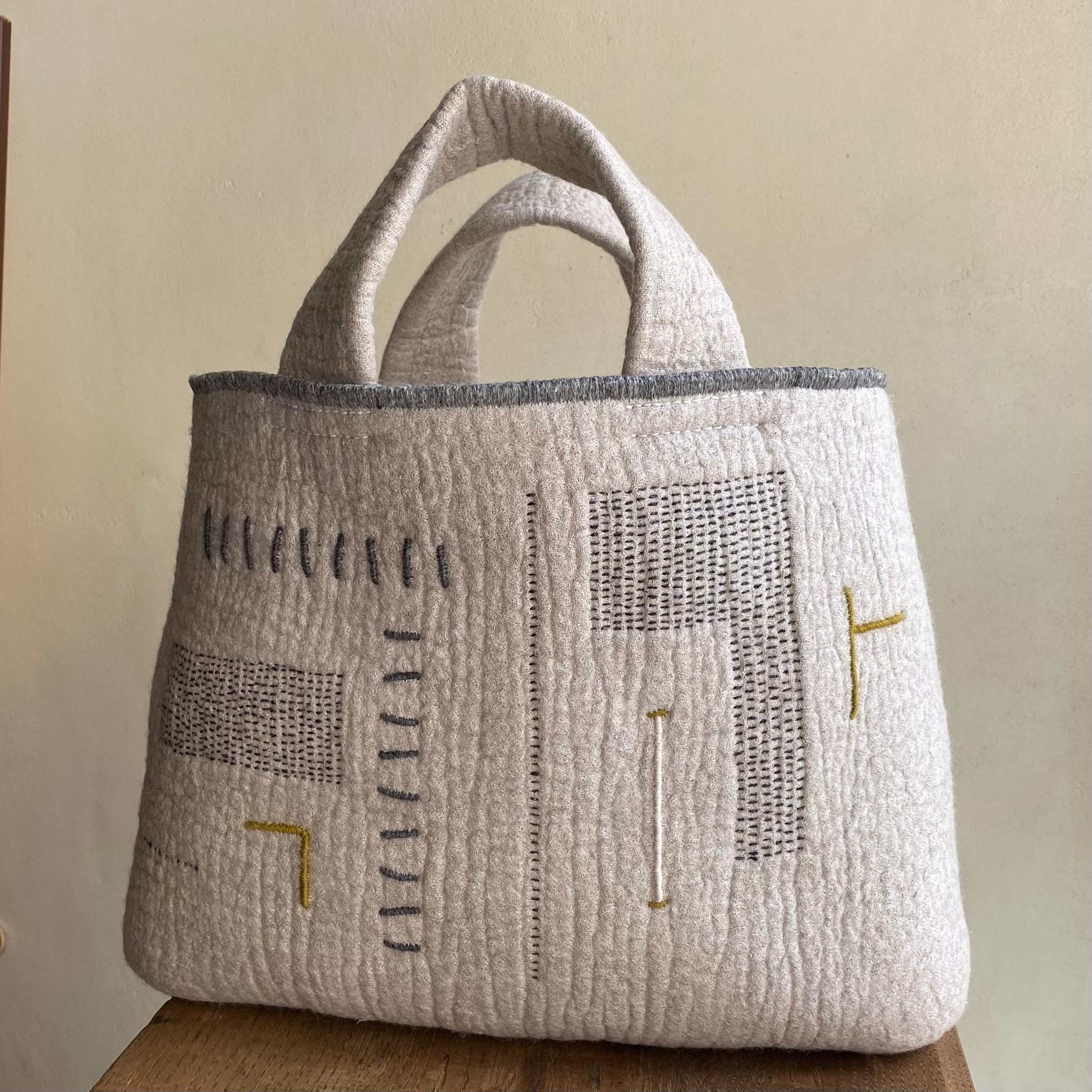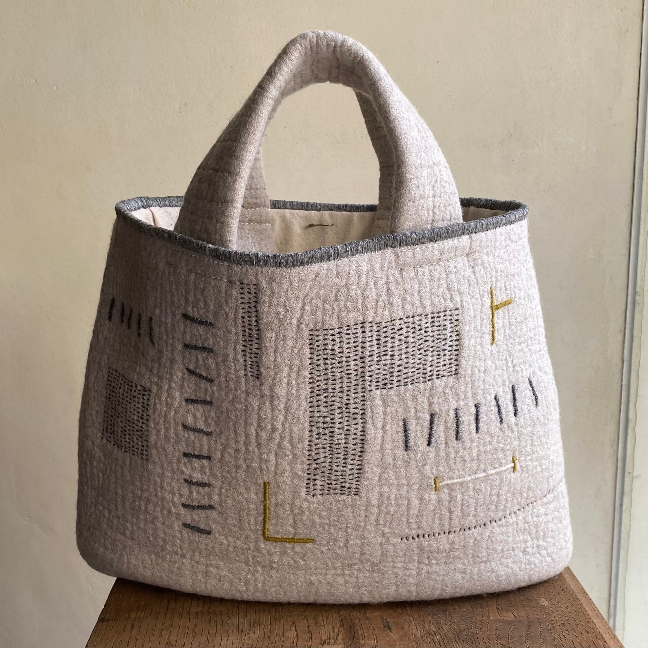 外側には手縫いでマスタードイエローやグレーの糸で刺繍が施されています。BAGの縁もグレーの糸を手縫いでかがっています。